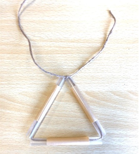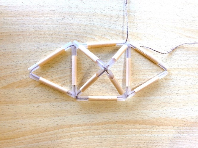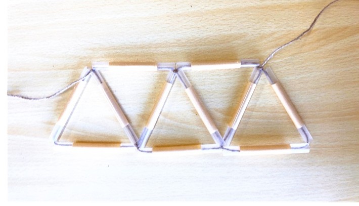 ストローを均等に切り、ヒモに通し三角にして、全部で5つの三角形を作ります✂️