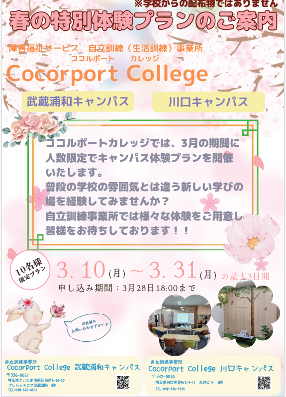 武蔵浦和キャンパスと近隣の川口キャンパスでは、特別企画として春の特別体験プランをご用意させて頂きました✌️