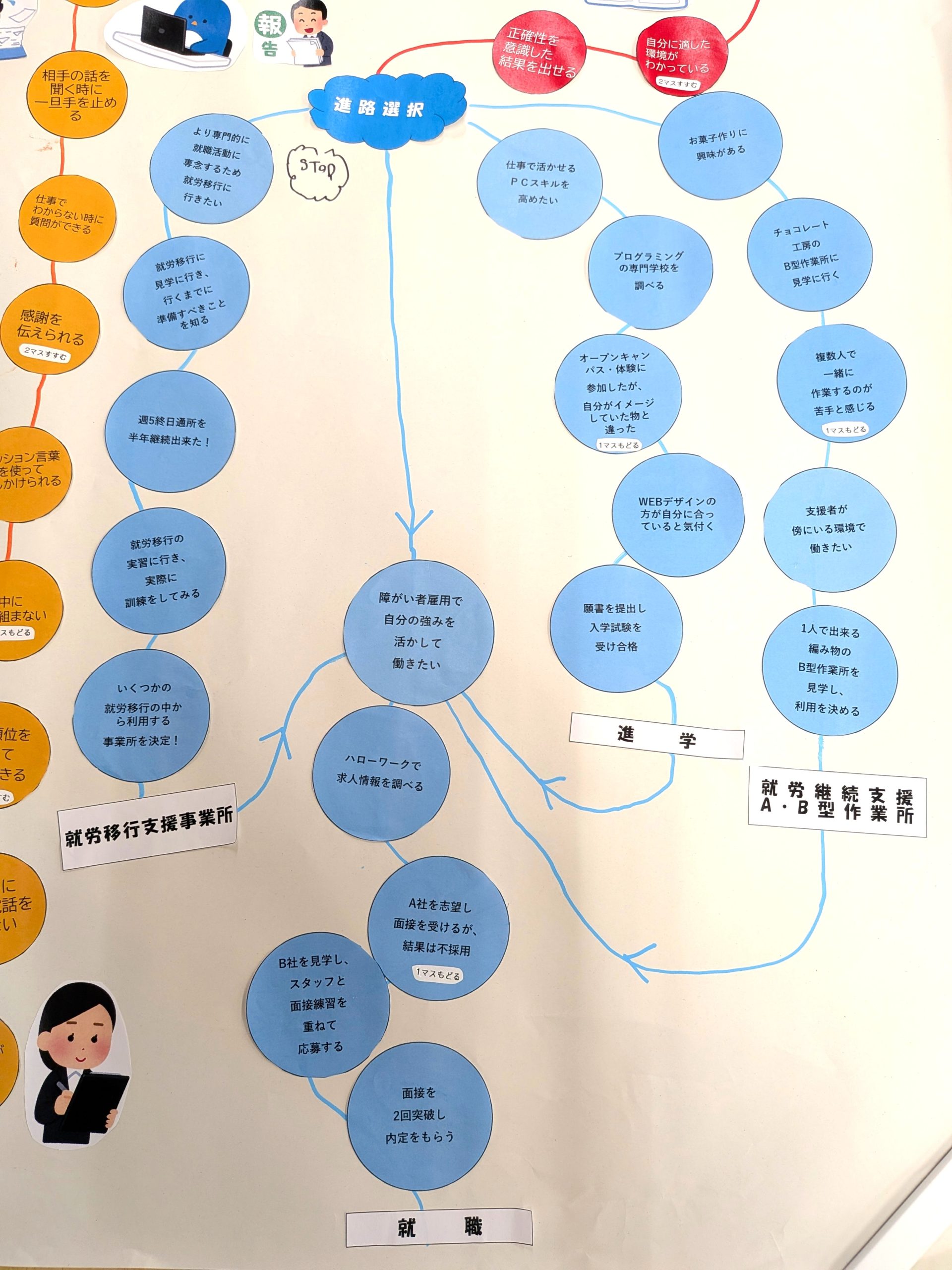 すごろくの一つひとつのマスには、進路先に向けて必要な日常生活の管理や対人コミュニケーション、就労スキルなどの項目が書かれています。訓練で一つひとつスキルを磨いていった先には「進路選択」があり、そこから人それぞれの道を歩んでいきます。