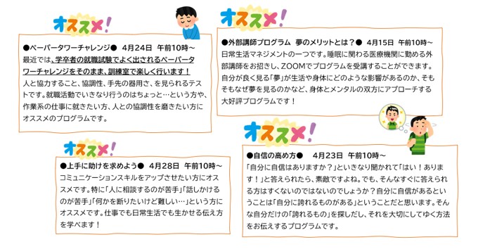 このようなプログラムがあります。もちろん、個別での対応も可能ですので、ぜひご参加ください。