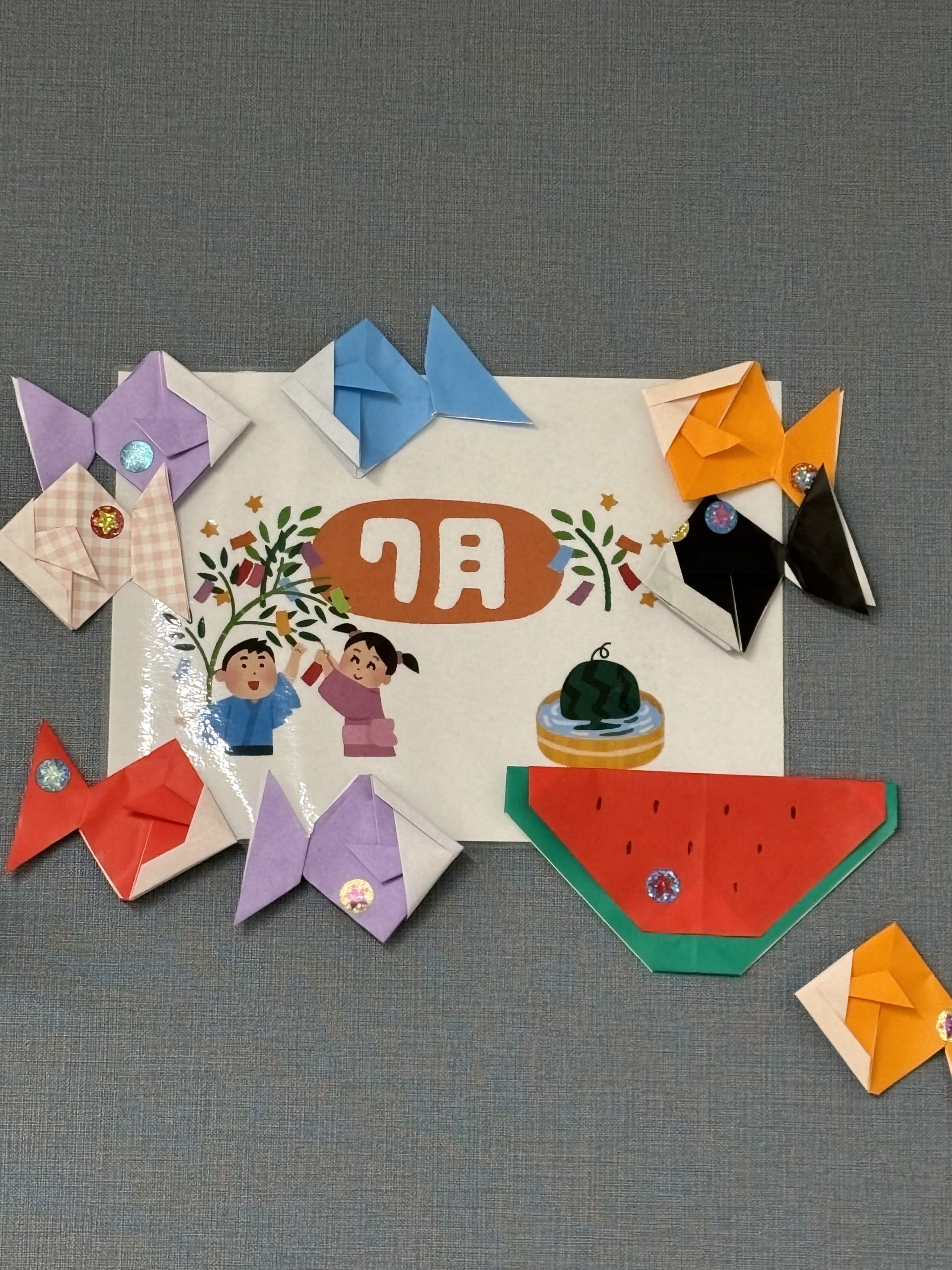 夏といえば金魚すくいかな~と思い、色々な色の折り紙を使ってメンバーさん達に
