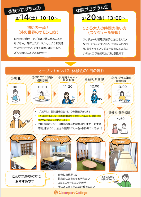 参加にあたって、大勢人がいる環境が苦手な方や別の日時をご希望される方は、調整しご案内させていただきますので、遠慮なくお申し付けください