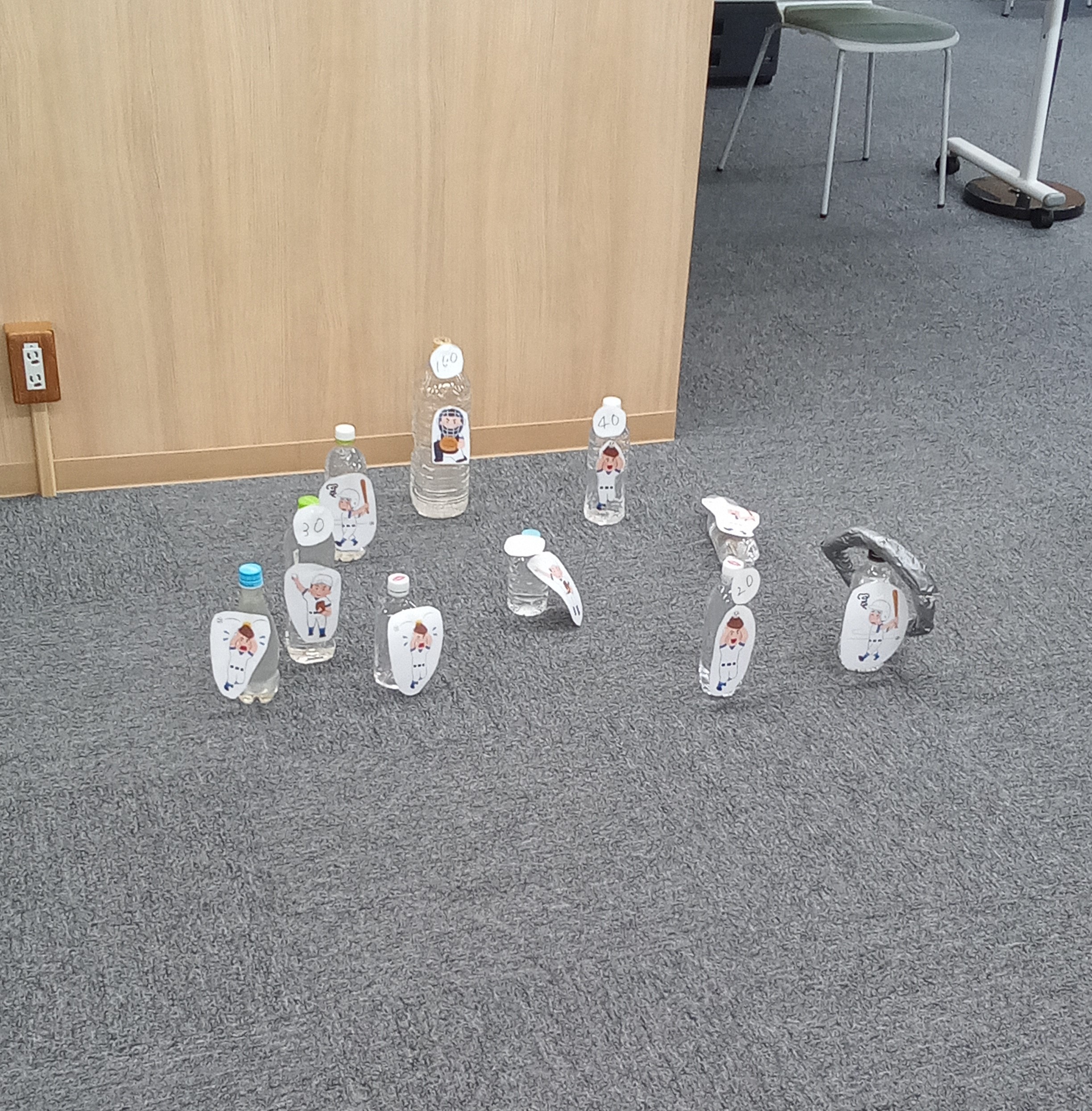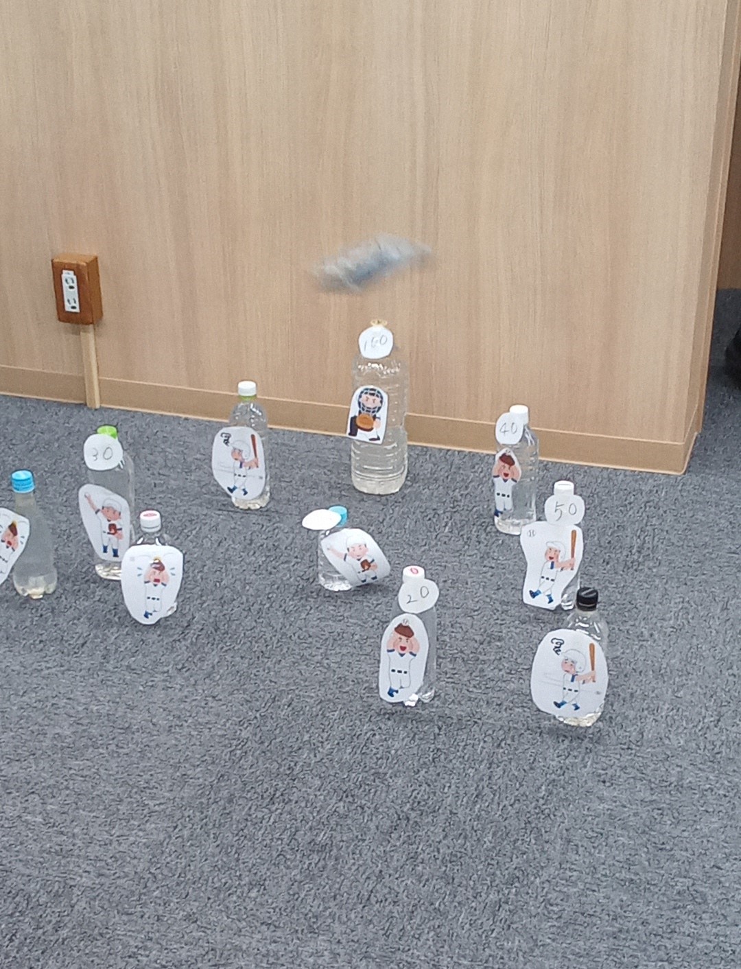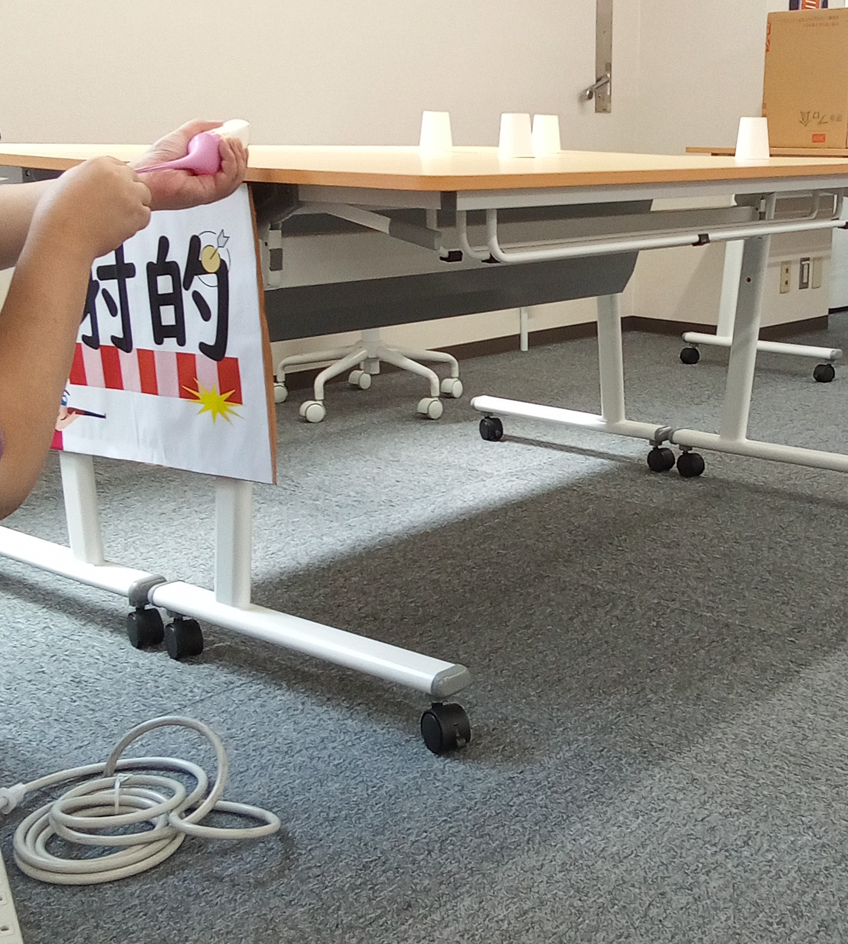 紙コップ+風船で作った鉄砲を使って、たくさんの的の紙コップを倒しました🌟
