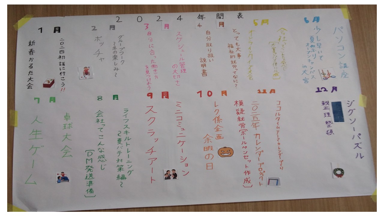 (メンバーさんが大宮キャンパスの年間スケジュールを模造紙にまとめ、掲示しました。また、メンバーさんの作品をきれいに並べて、