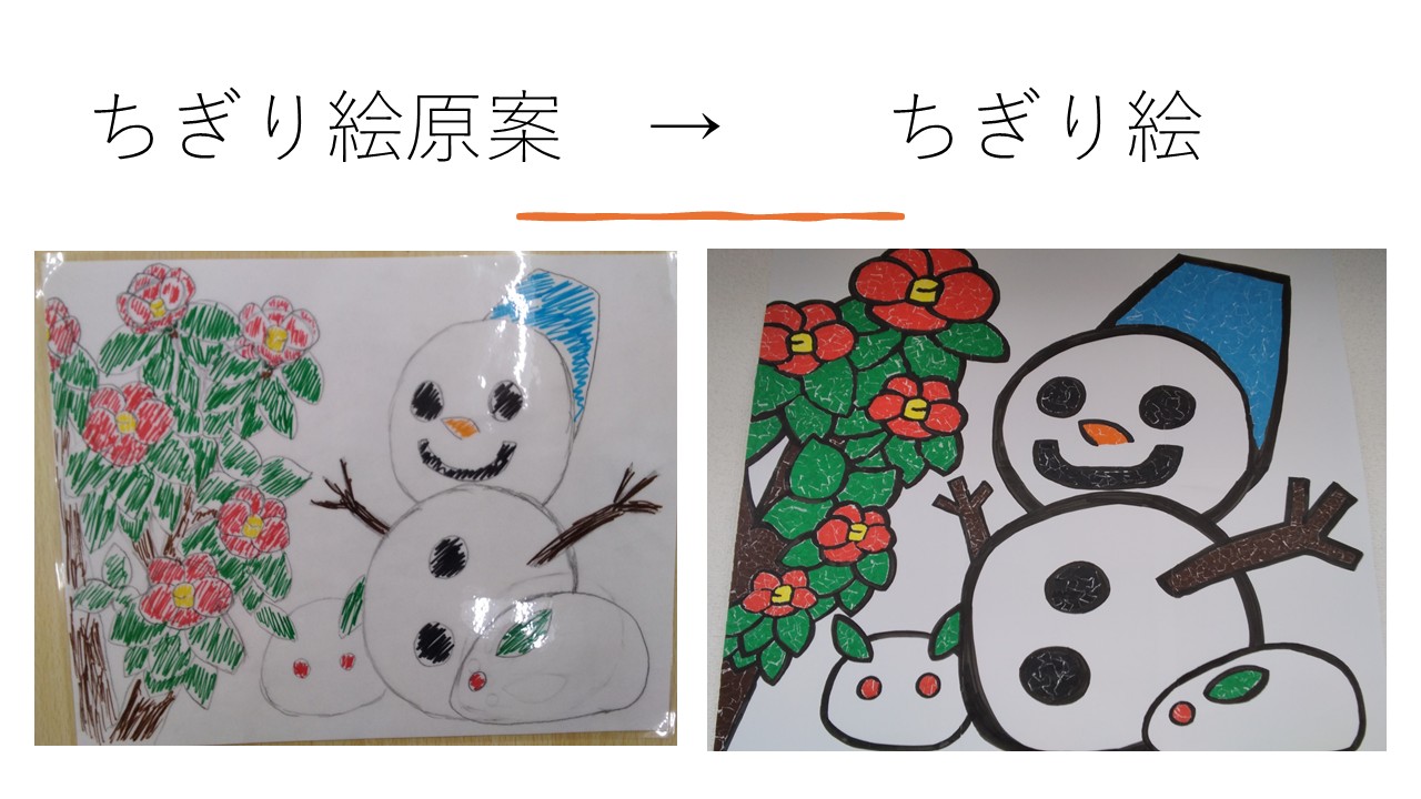 また、メンバーさん同士で協力して2月をテーマとしたちぎり絵を制作しました。
