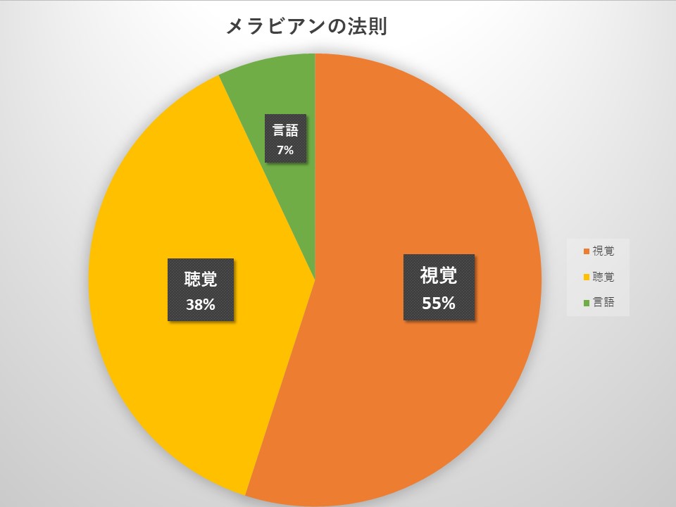 なんと、会話の中で話し手が聞き手に与える影響は、言語・聴覚・視覚のうち、視覚が与える影響が最も大きいのです!