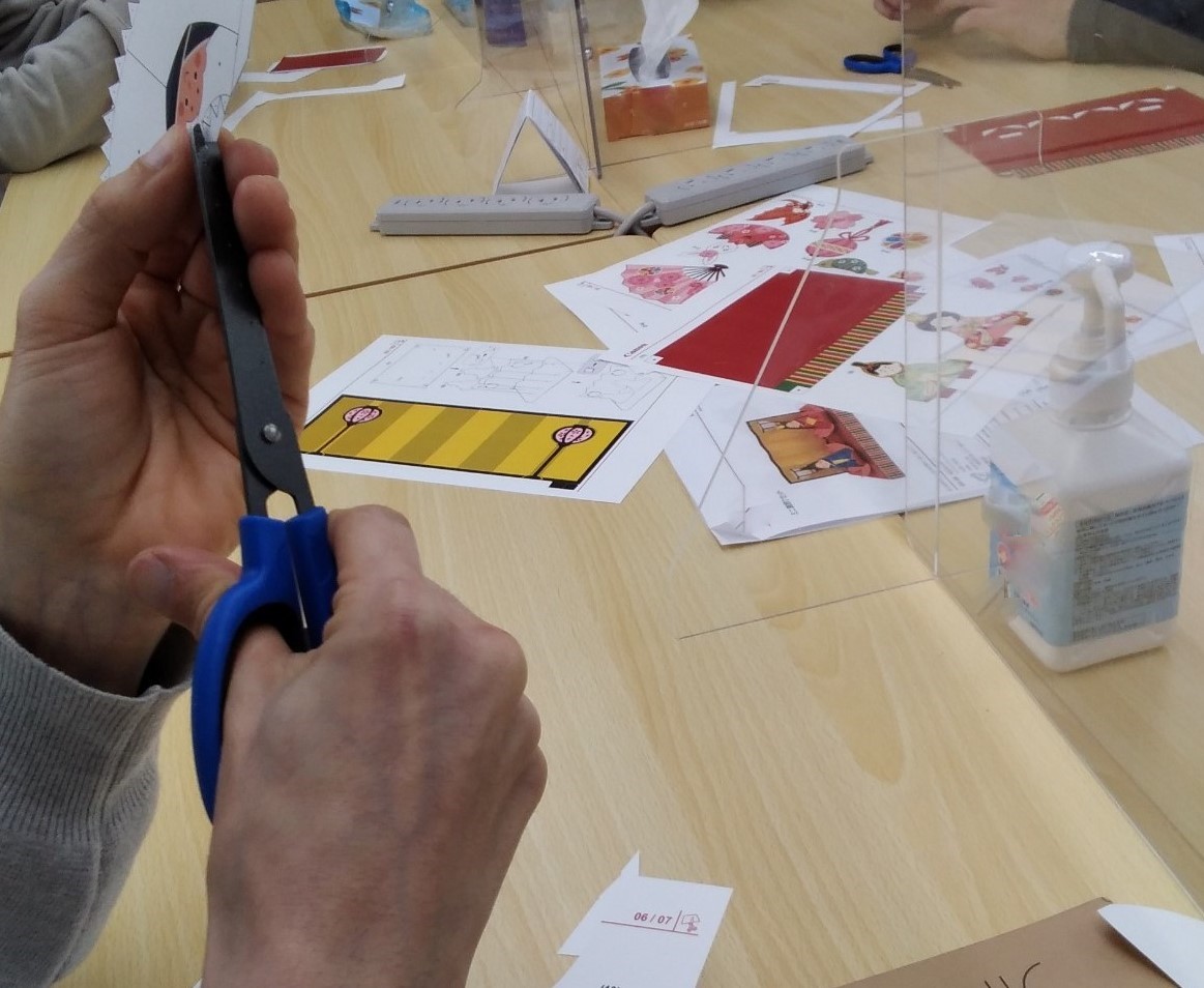 ①はさみで切り取り→②点線に沿って折る→③のりを貼りつけて組み立て作業
