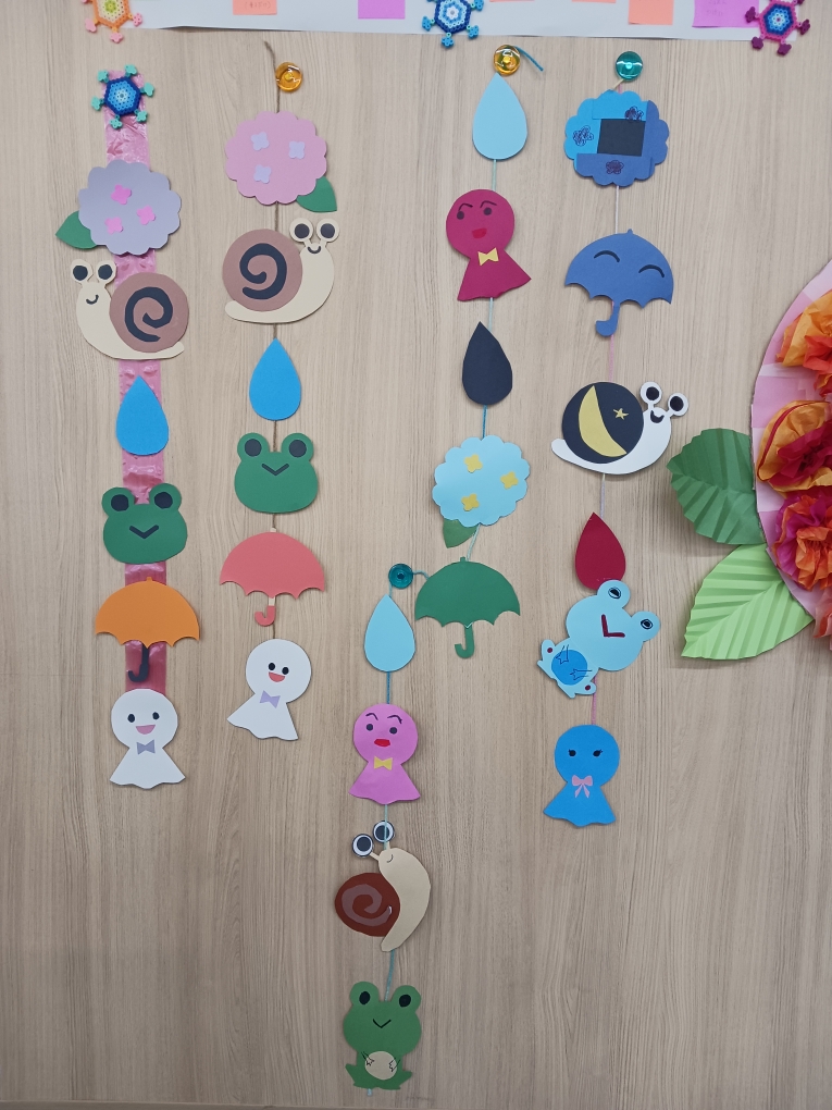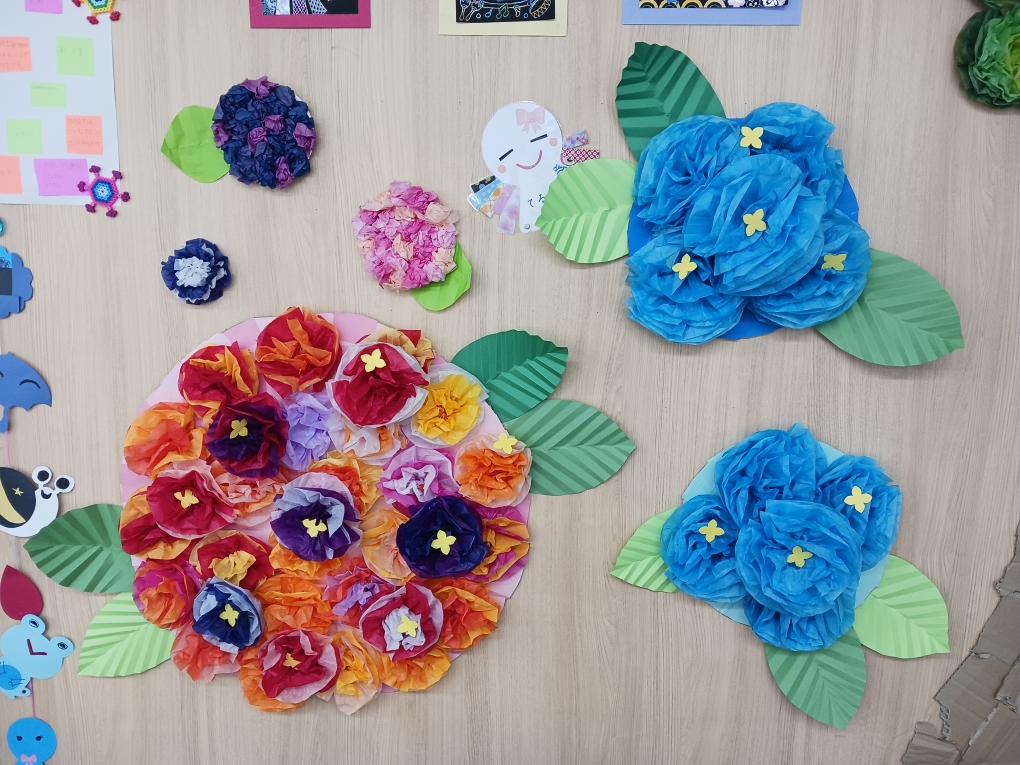 6月は、梅雨をモチーフに、大きくて豪華なアジサイと、かわいらしい梅雨ガーランドが完成しました👏✨