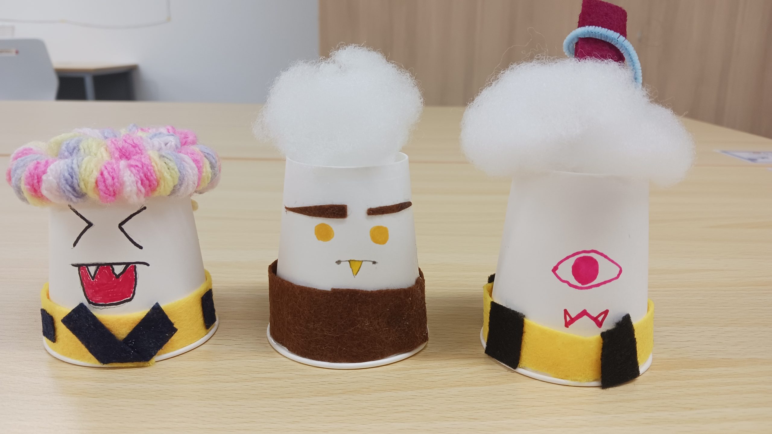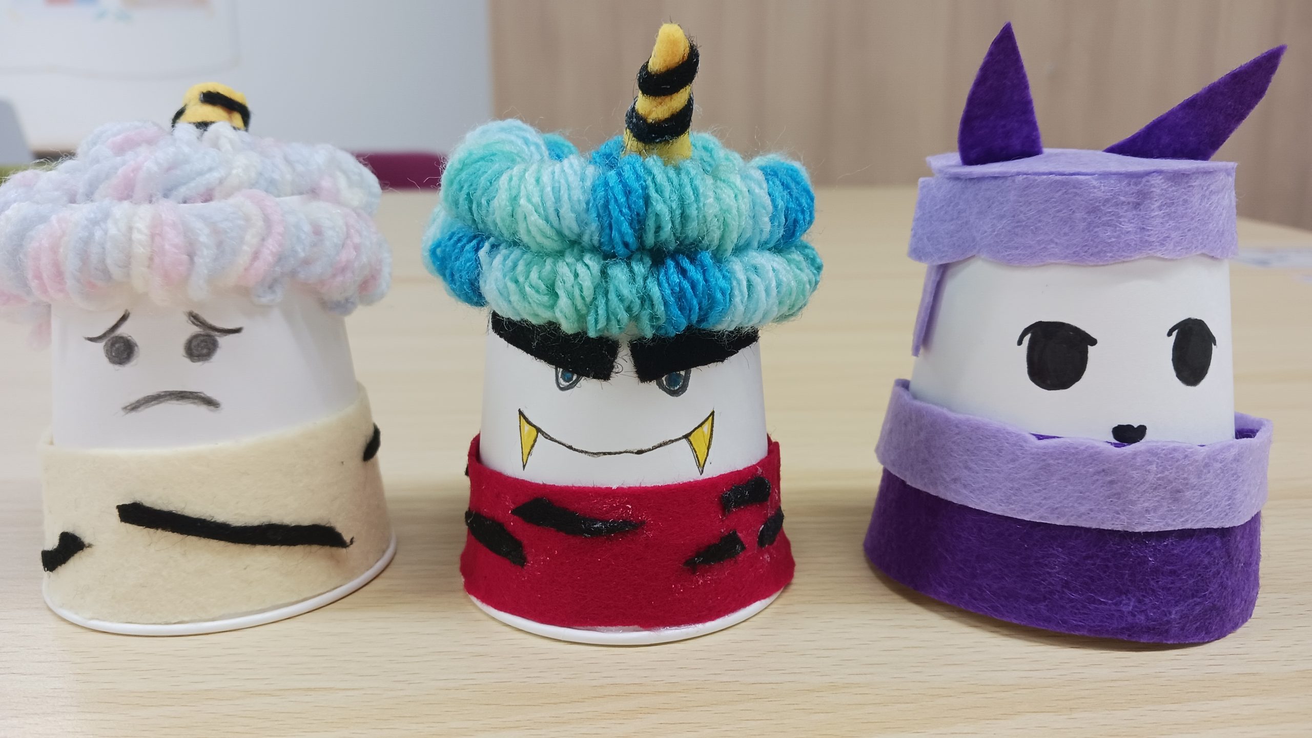 作業内容は、紙コップにそれぞれ自由に顔を描く、フェルトを切って鬼のパンツを作成、毛糸を丸めて鬼の髪の毛作成、フェルトで角の作成。