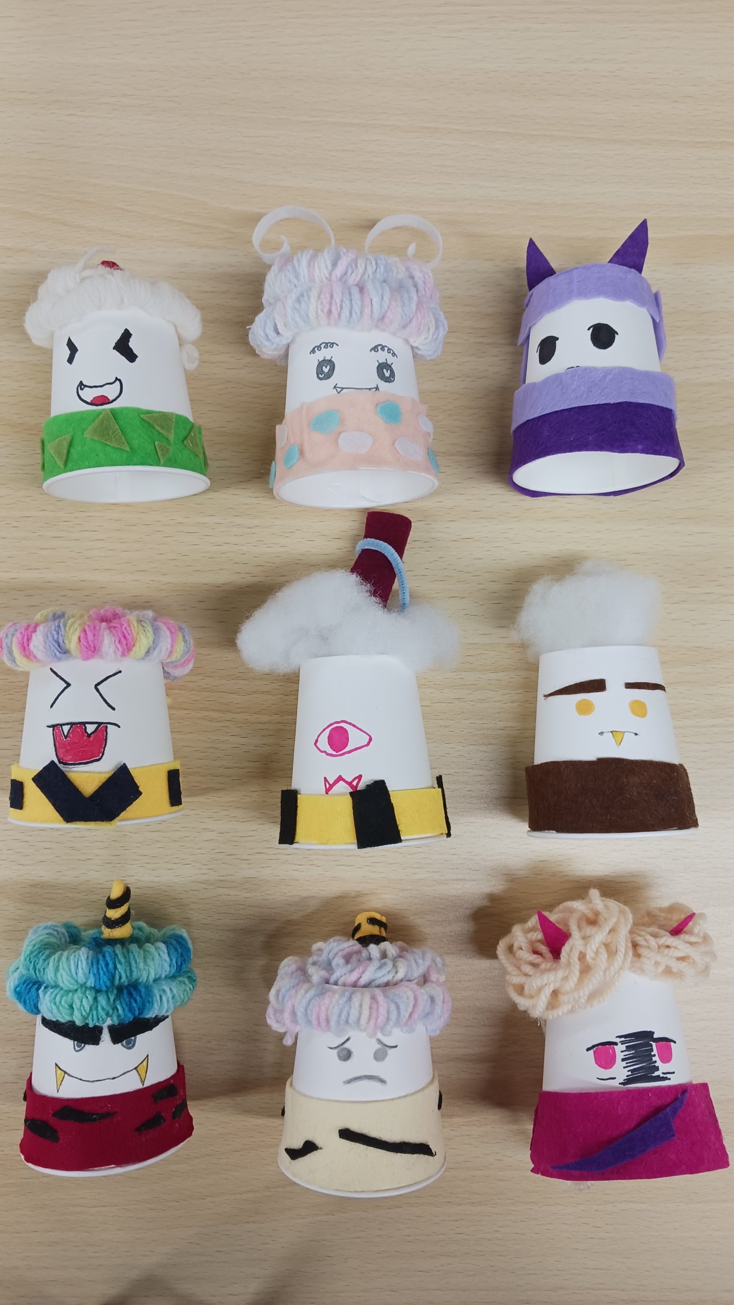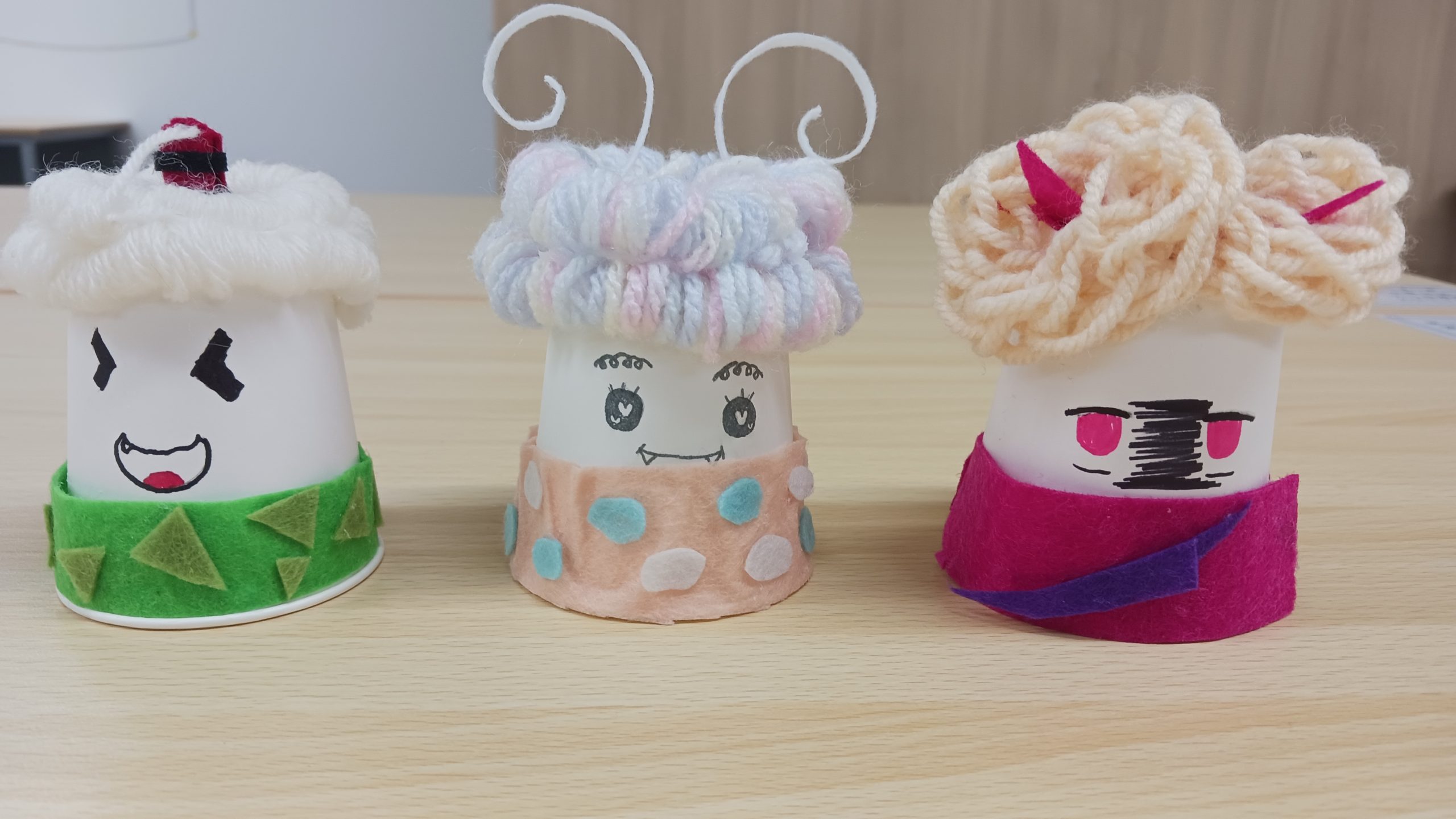 材料は、紙コップ、フェルト、毛糸、顔を描くもの(カラーペン)などで作れます。