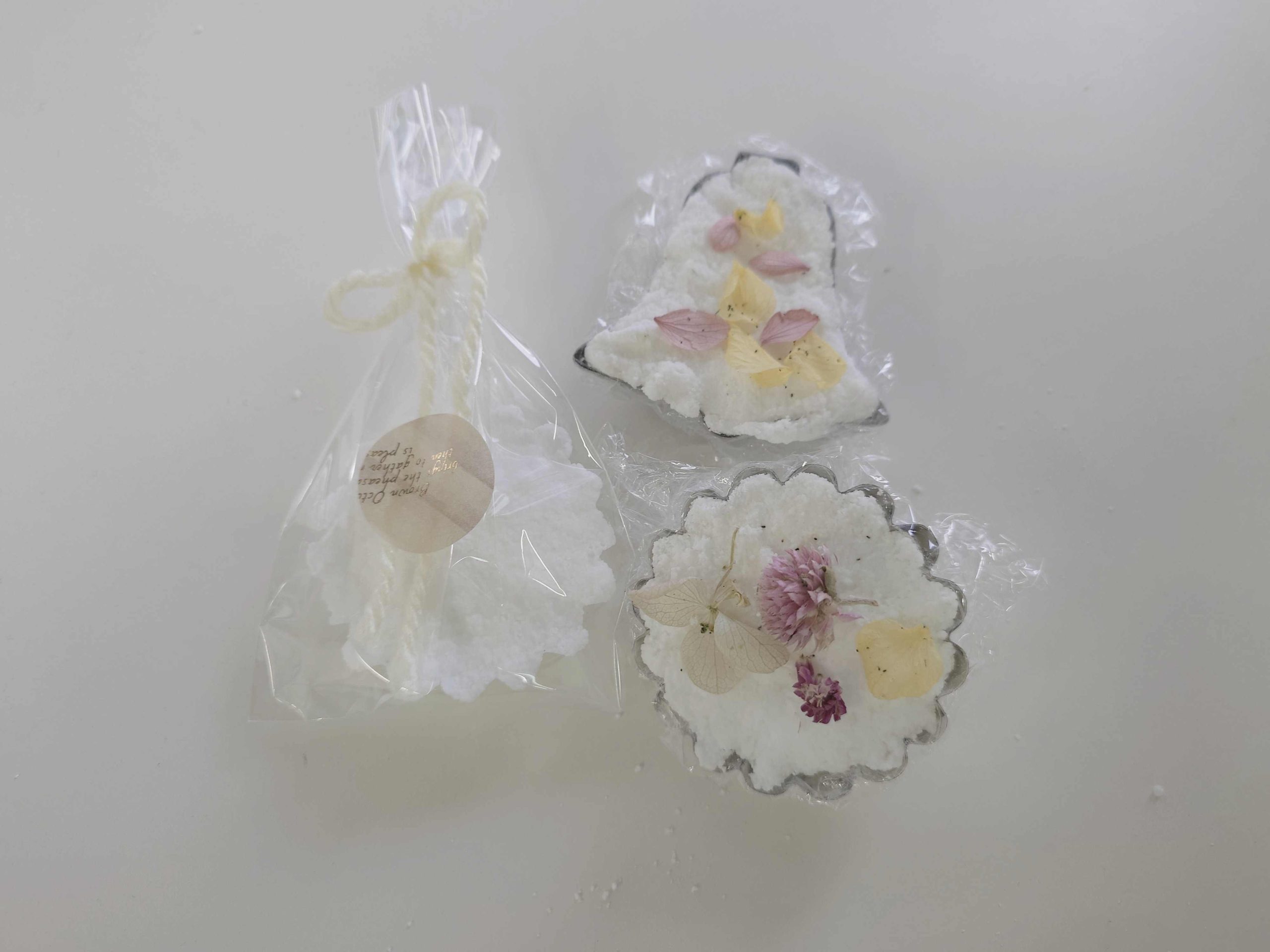 写真は出来上がってラッピングしたもの(左)と、乾かしている途中のバスボム(上、右)です。
