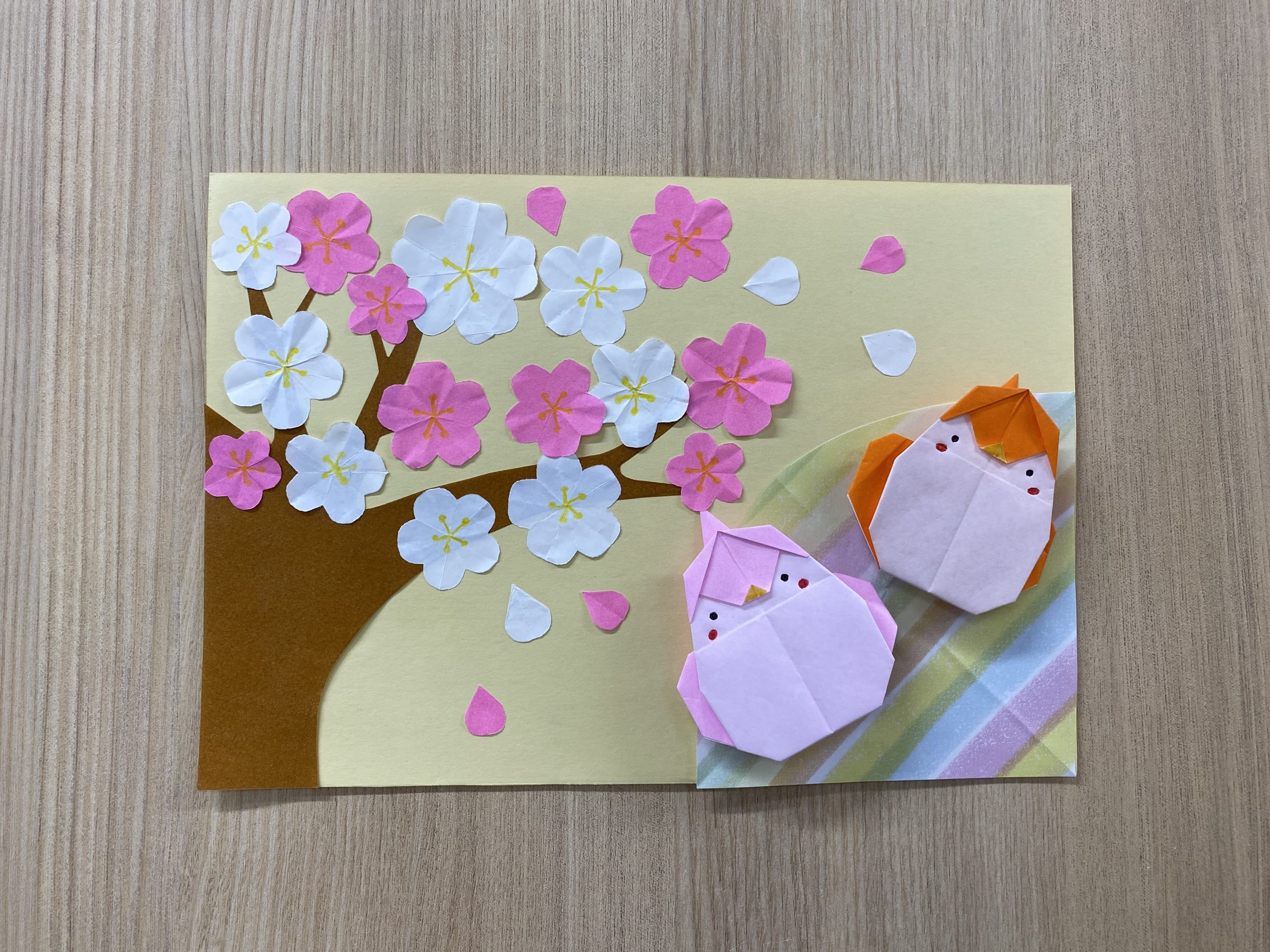 梅の花は、分かりやすいように、花の中心に黄色の色鉛筆で模様を描かれるほどのナイスアイデアっぷり!