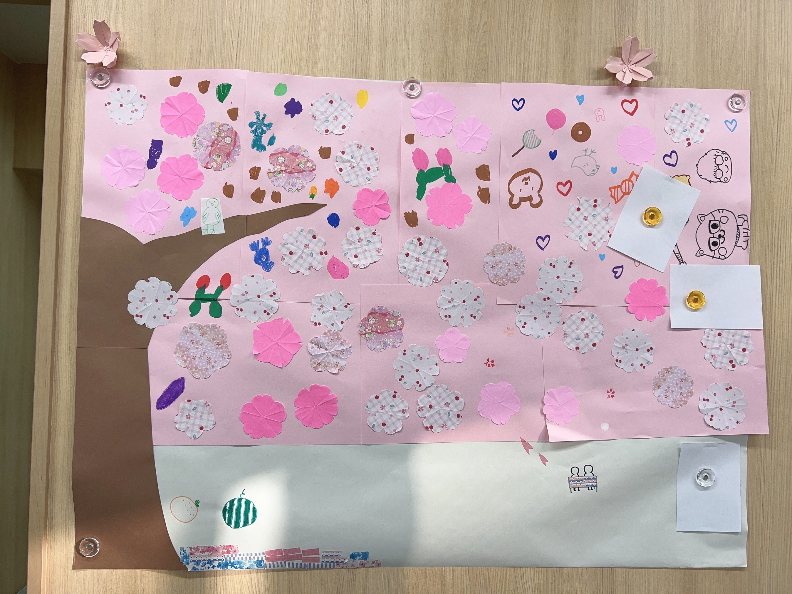 利用者さん達が、色画用紙を貼り合わせて大きな桜の木を作り