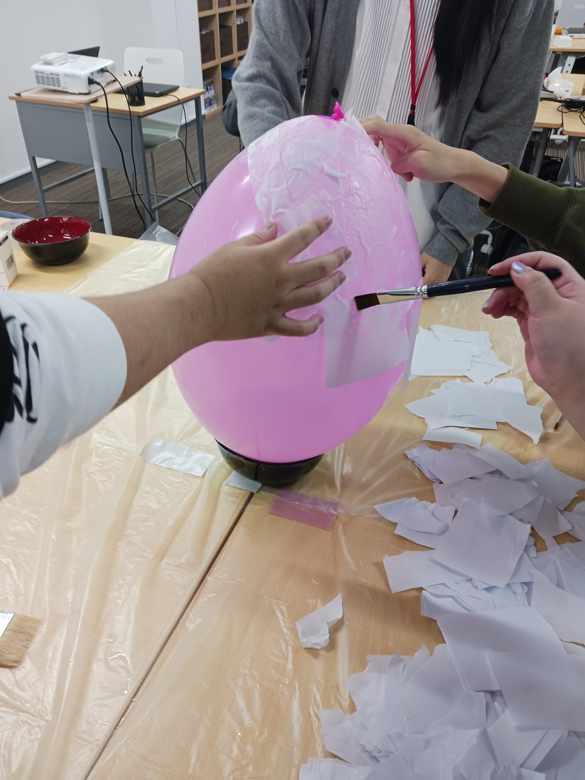 次に膨らませた風船が割れないように、洗濯のりで小さくちぎった半紙をはりつけていきます。