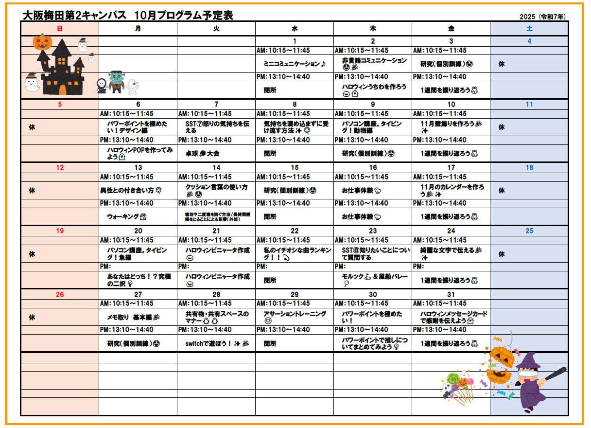 10月もコミュニケーションや運動、パソコンの訓練やビジネスマナーなど実践できるお仕事体験など様々なプログラムを準備しています🎉