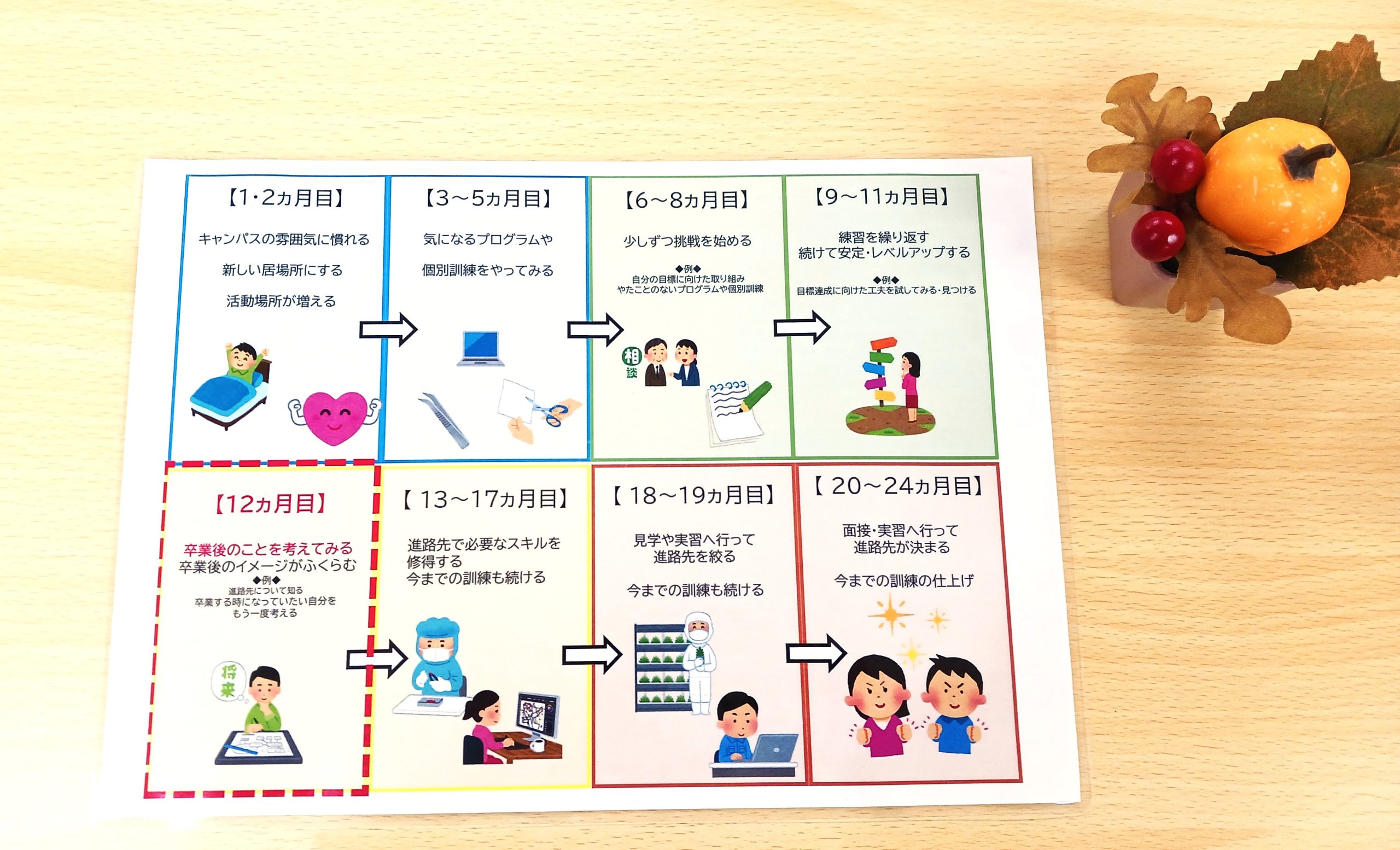 色々なことに触れ体験していく→プログラムを通してルールやマナー・セルフケアなど生活・仕事に必要な色々なことを学んでいく→学んだことを実際に様々な場面で実践していく