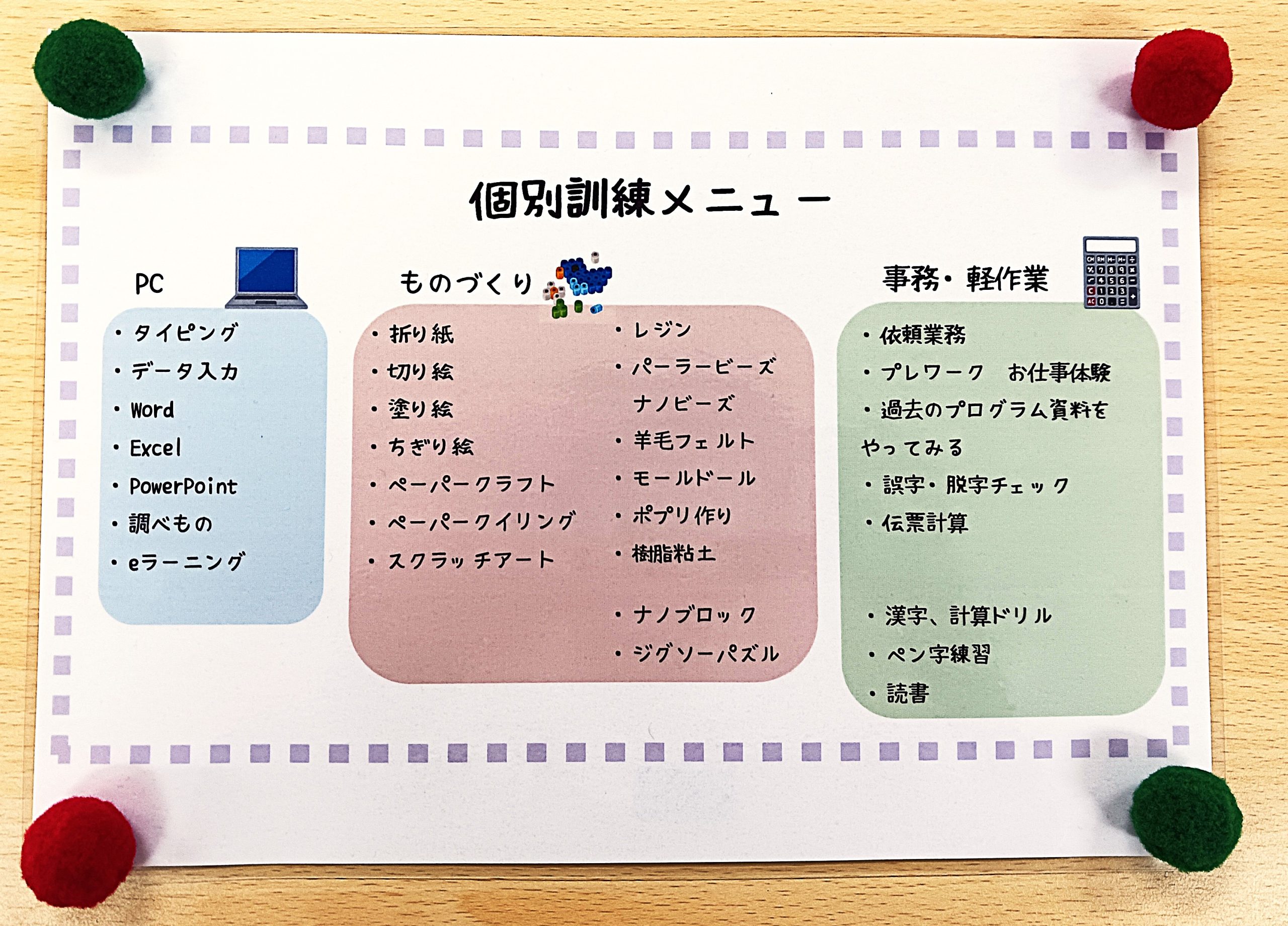 種類も豊富で簡単な創作系から就労系までさまざまなプログラムを行っています。
