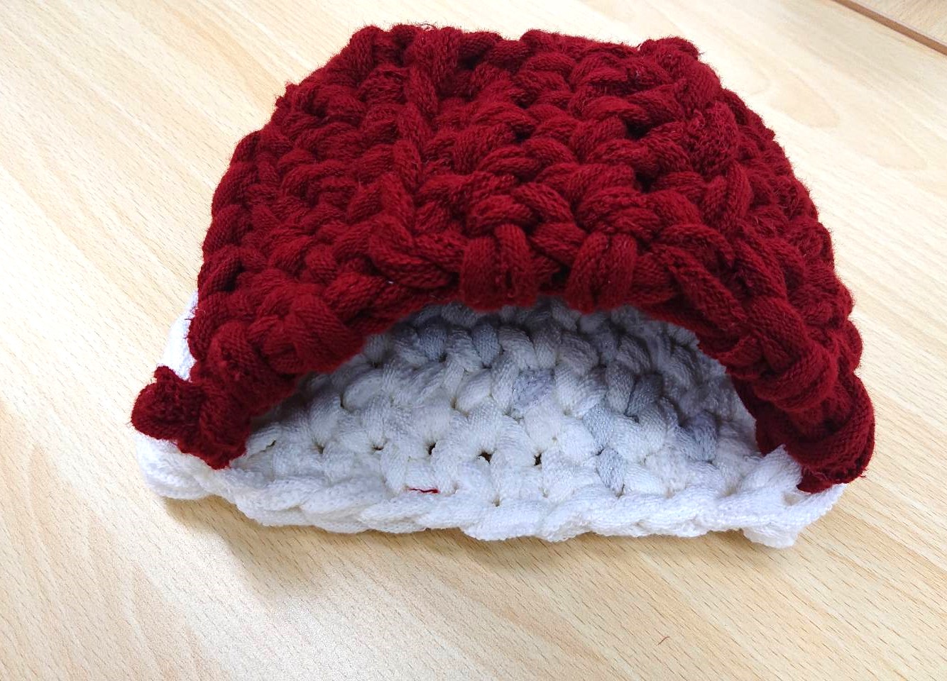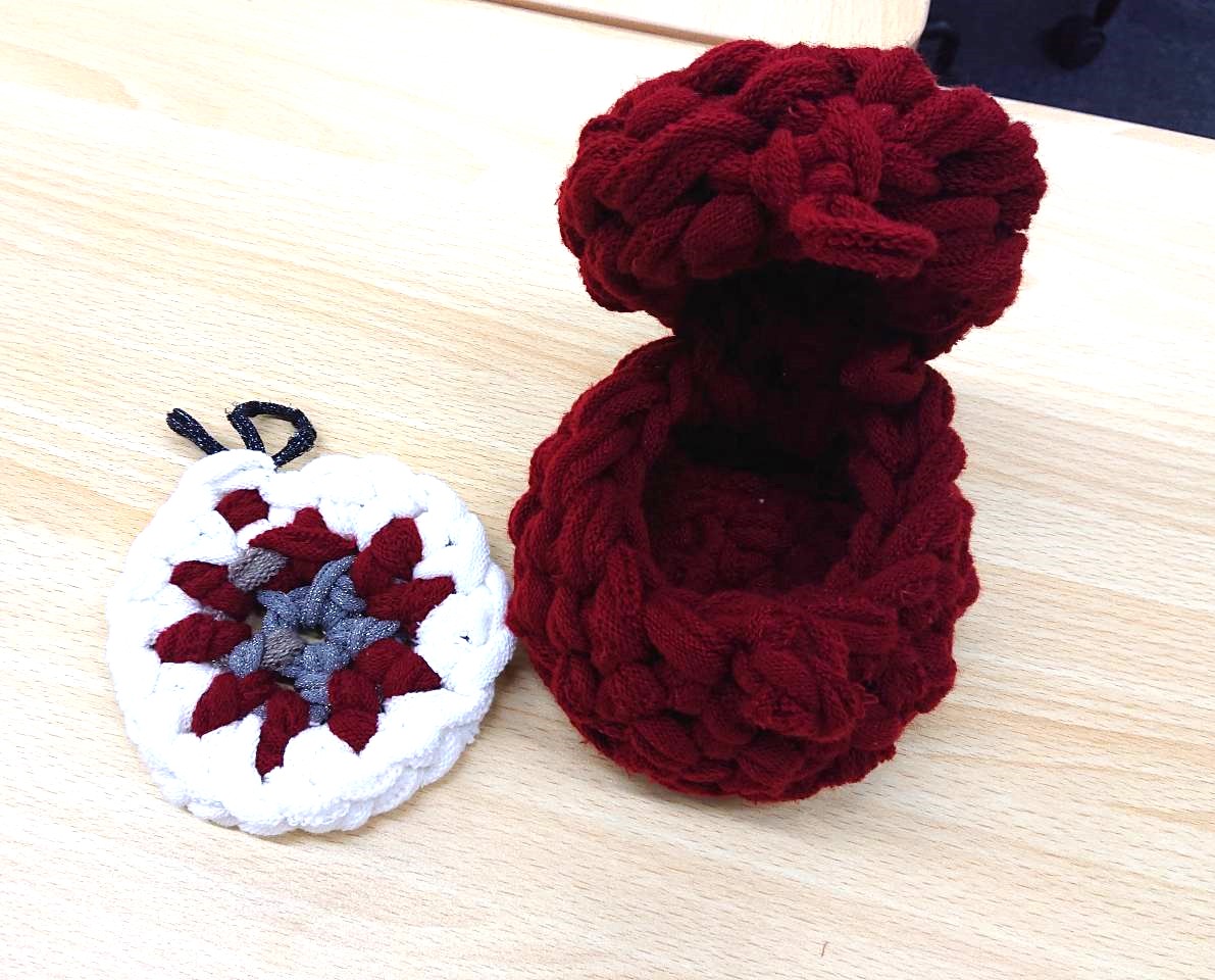 このはぎれわっかを靴下工場からいただき、さまざまな作品を作っていきます。