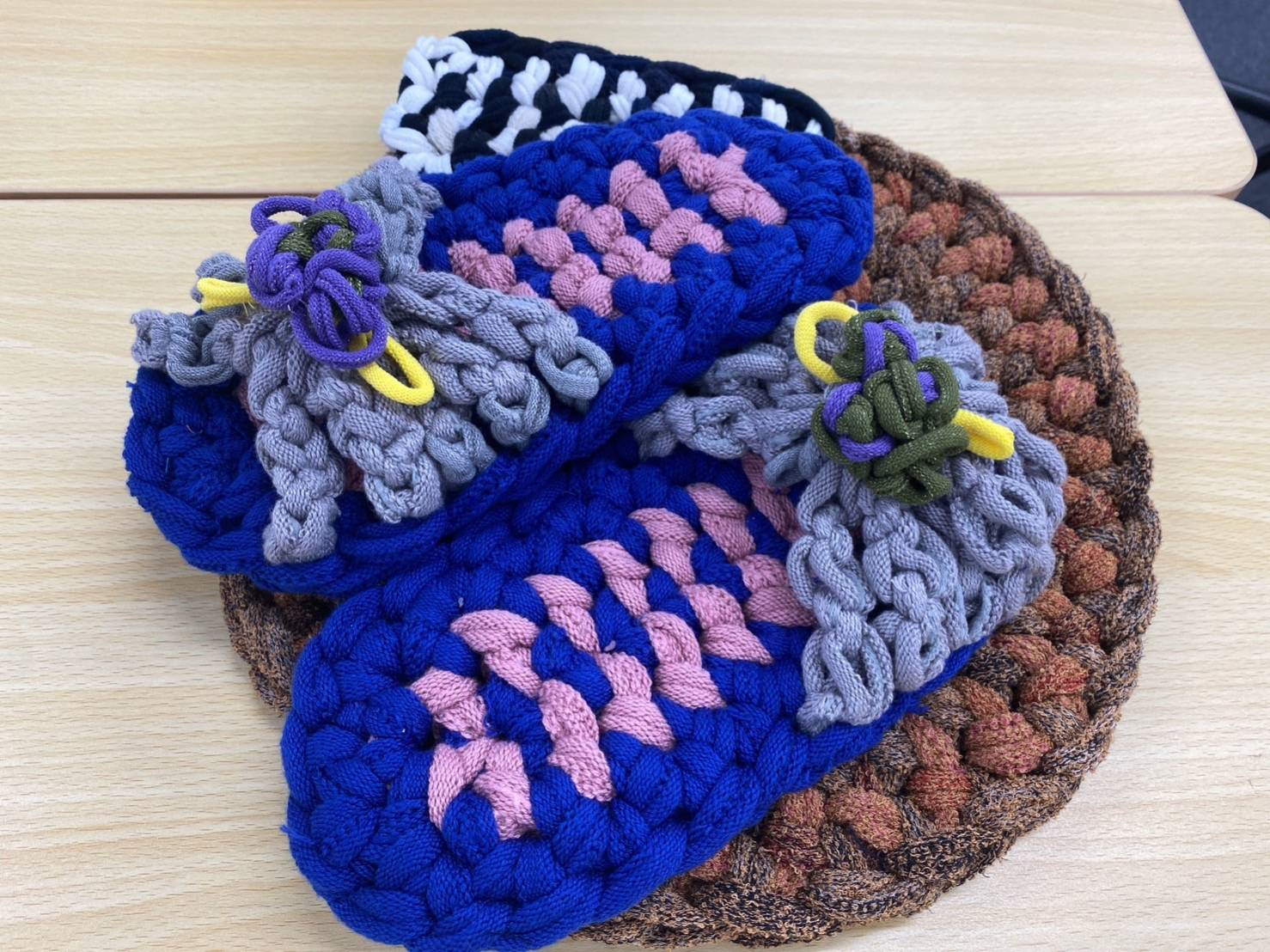 現在、就労継続支援B型事業所さんでは検品作業や封入作業のほかに、オリジナル作品として廃油石けんつくりや、輪っか状の端切れを使用した指編み作品など、さまざまな活動をされているそうです。