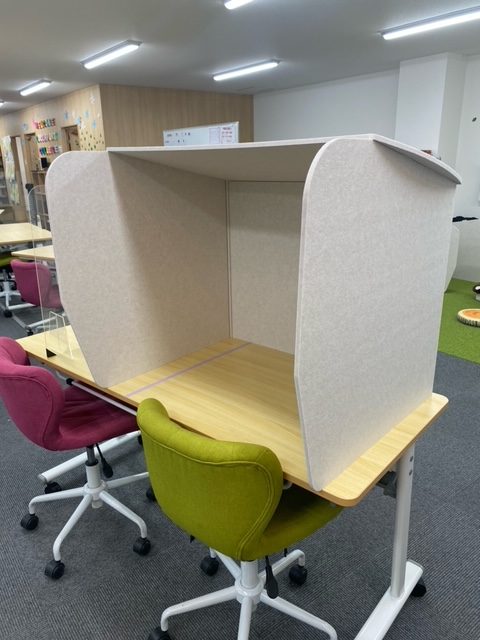 壁を向いた席は個別訓練席となっており、集中して作業をすることができます。また、落ち着く時間が欲しい方や人がたくさんいる場所が緊張してしまう方にもオススメの席となっております。