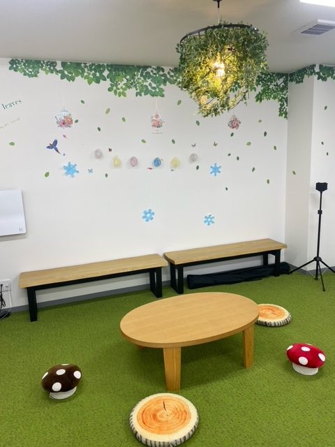 芝生をイメージした絨毯や木のベンチ、壁には葉っぱがあり落ち着いた温かい雰囲気となっております。