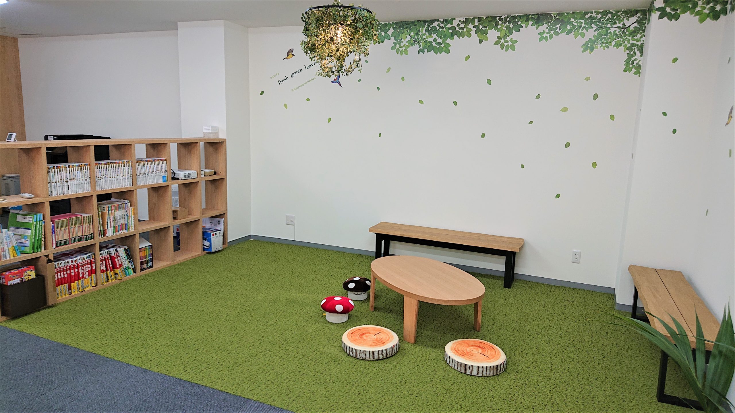 リラックススペースには、図鑑や漫画で学ぶテキストなどの本が100冊以上あり、疲れた時やお昼休みなどに本を読んだり、くつろいだり横になったりすることもできます。