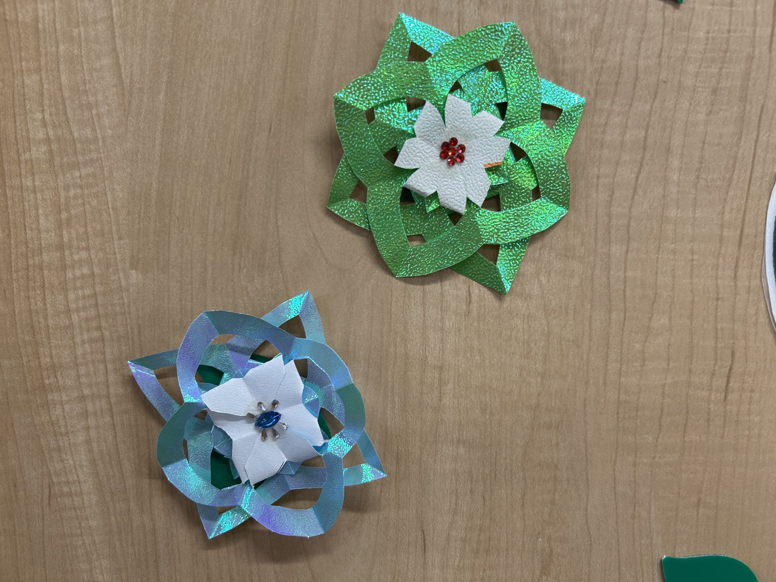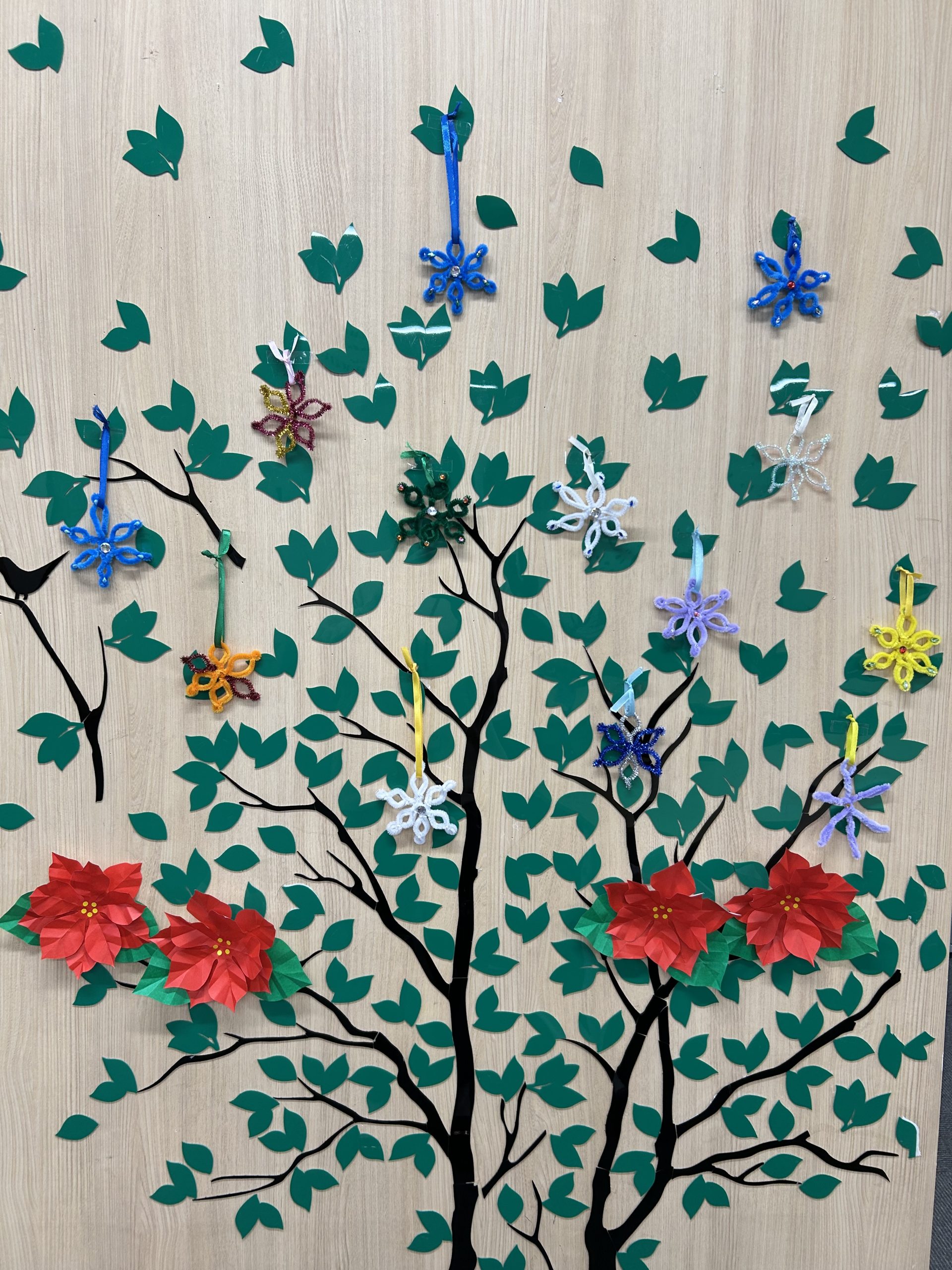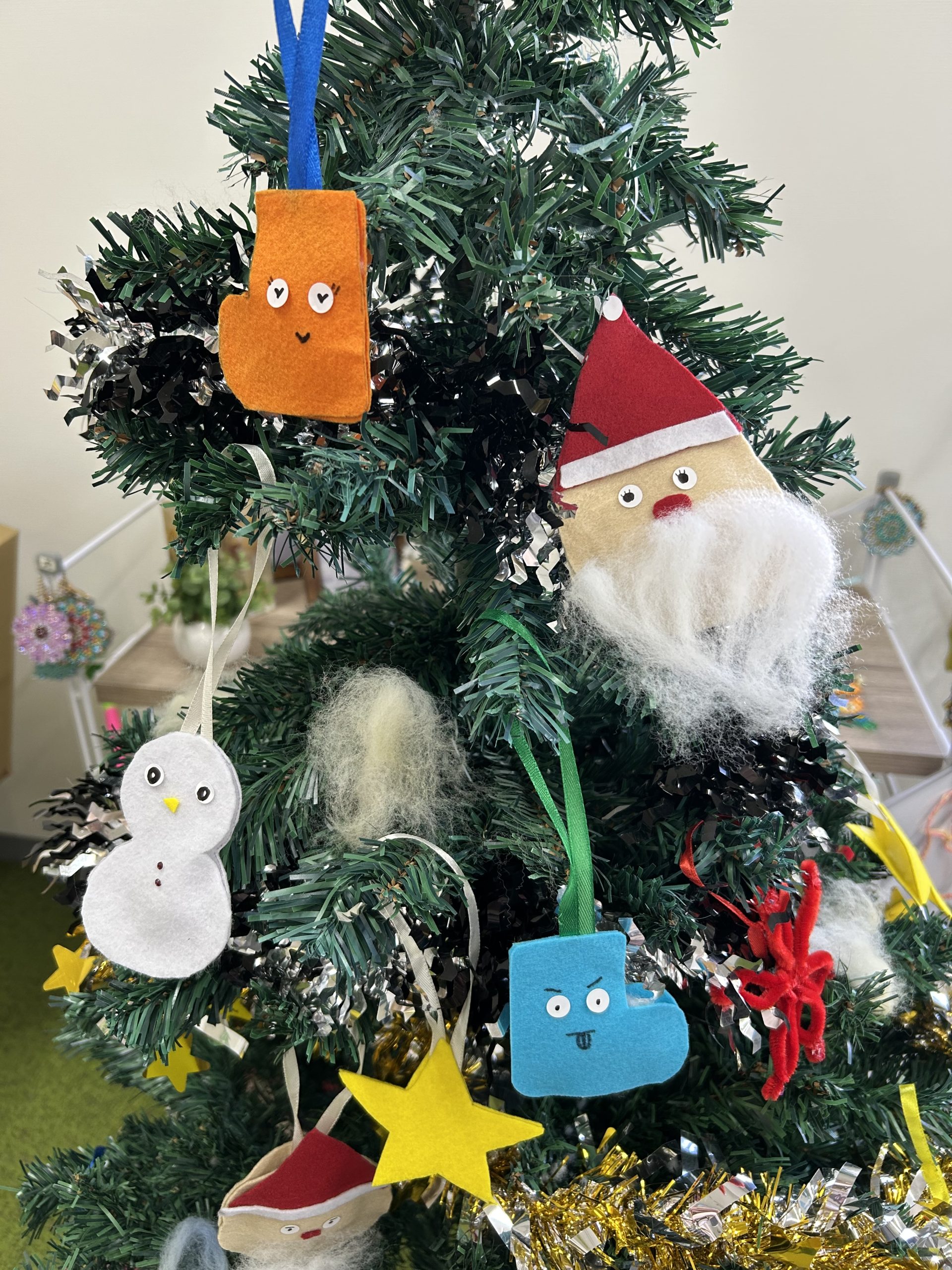 今年は①ツリーのオーナメント作り②モールで雪の結晶作り③オーロラ折り紙でお花作りの3種類を作成いたしました!