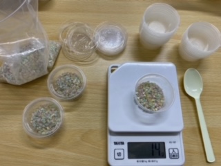 計りを使い指定された量を計量し、パック詰めする作業です。