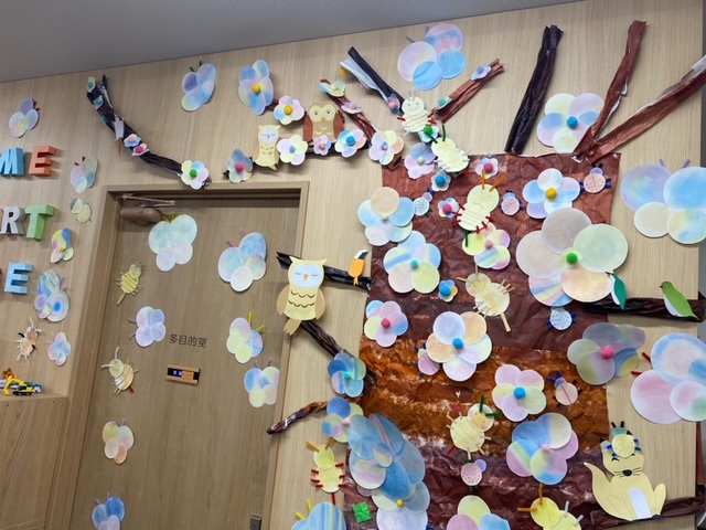 折り紙や画用紙で動物や菜の花を作成し、さらに春の訪れを感じさせる壁面となりました!
