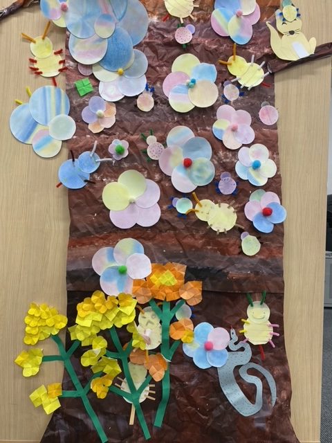 丸い紙を組み合わせてカラフルなお花、蝶々、てんとう虫、蜂を作成いたしました🫧