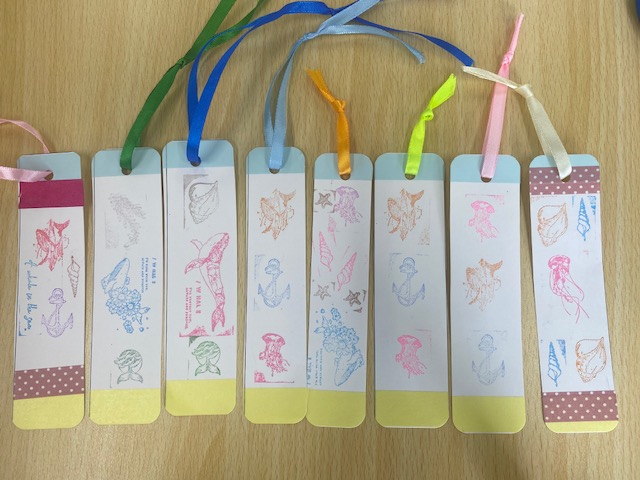 紙を指定された大きさに切る、マスキングテープやスタンプを選択して組み合わせる、真ん中に穴をあける、リボンを通して結ぶという細かい作業が盛りだくさんの訓練です。