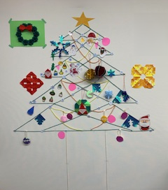 みなさんで一緒に壁のクリスマスツリーを飾るオーナメントを作るプログラムが行われ、