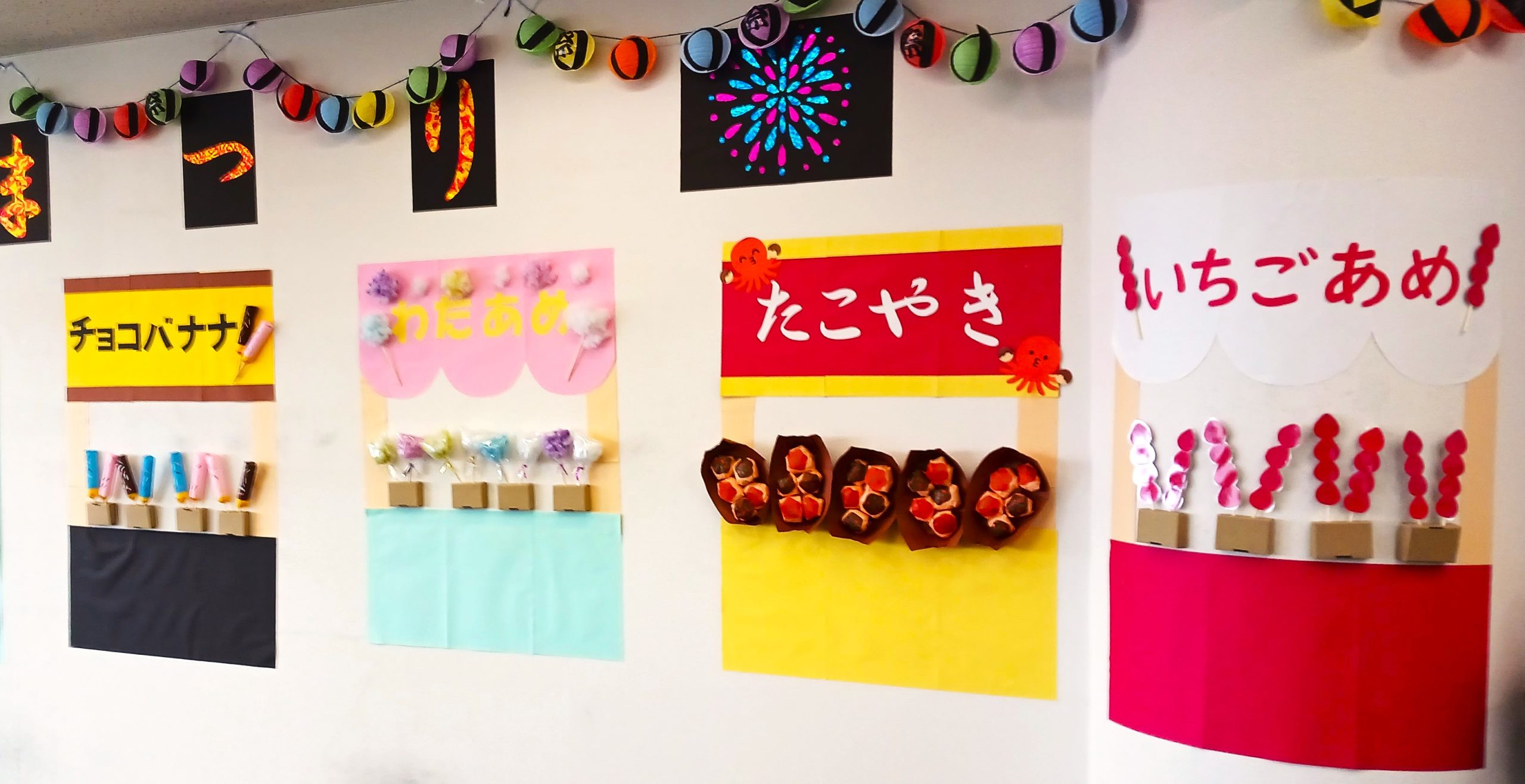 本物そっくりで、お祭り気分を味わうことができます✊🎈『まつり』の文字と花火は、すべてちぎり絵で作られています☘ メンバーさんが折り紙を1枚1枚を切り貼りしながら、丁寧に作業してくださいました🤲