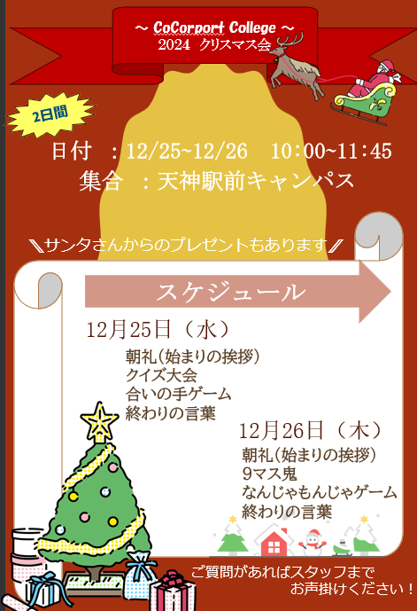 また、12月にキャンパスの目玉企画!「クリスマス会」が12月25日,26日の2日間連続で行われます!