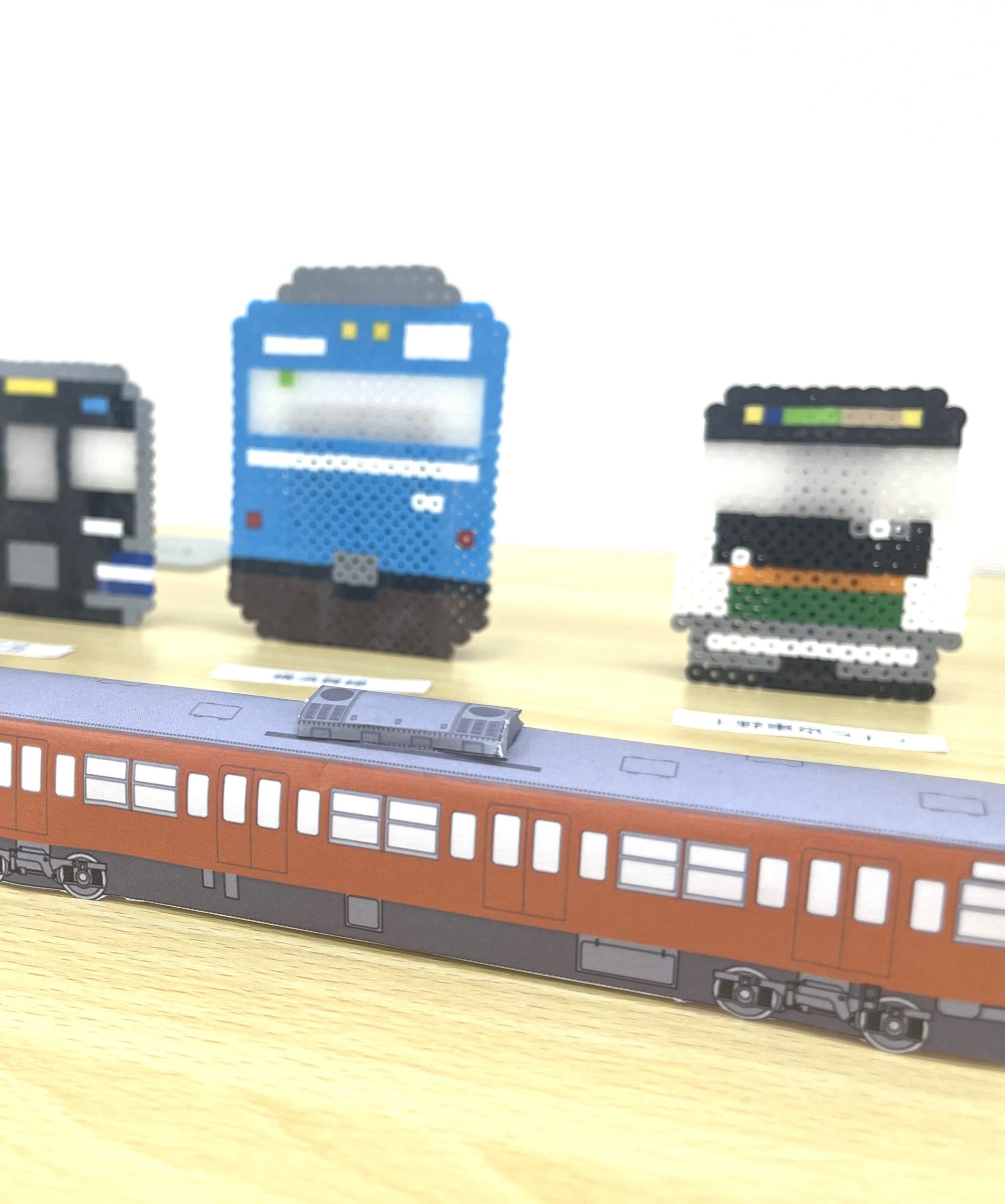 訓練で作った電車のアイロンビーズとクラフトペーパー! パソコンで好きな電車を検索し画像を見ながら制作しました🚃
