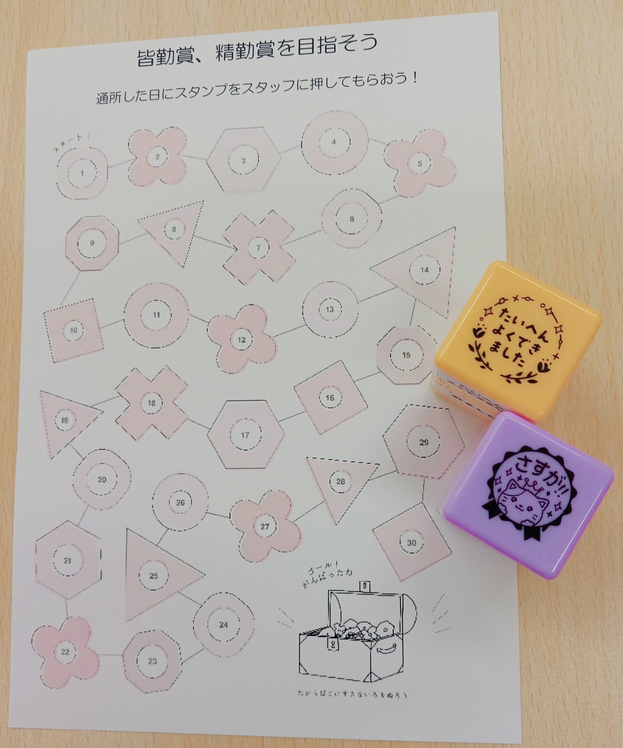 「皆勤賞・精勤賞を目指そう」というカードを取り入れ、通所した日にそのカードにスタッフからスタンプを押してもらう形で行っています☆