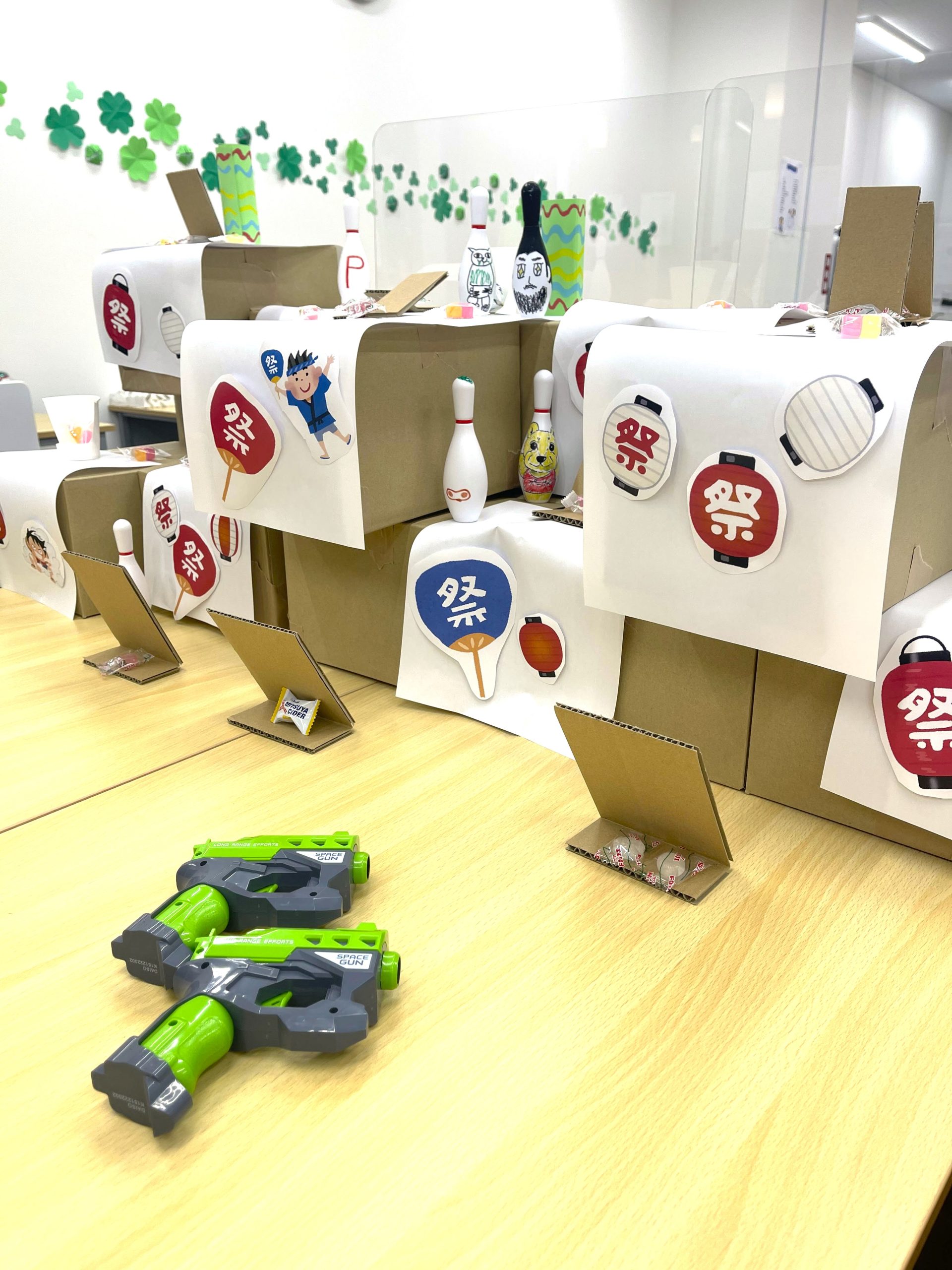 手作りの射的台に景品のお菓子とメンバーさんが描いたピンを並べました!みなさん真剣に狙いを定めて射的をしていま🤣