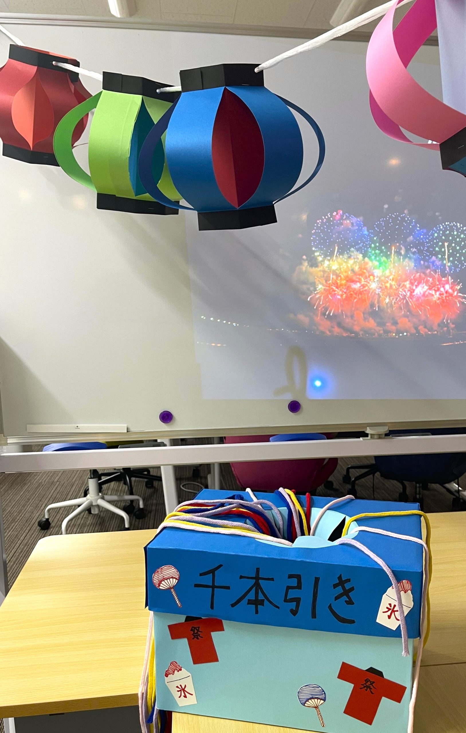 キャンパス内を暗くし、花火大会のプロジェクターをホワイトボードに投影し、祭り雰囲気一色に!!!盆踊りのBGMを流しリアルなお祭りを再現!