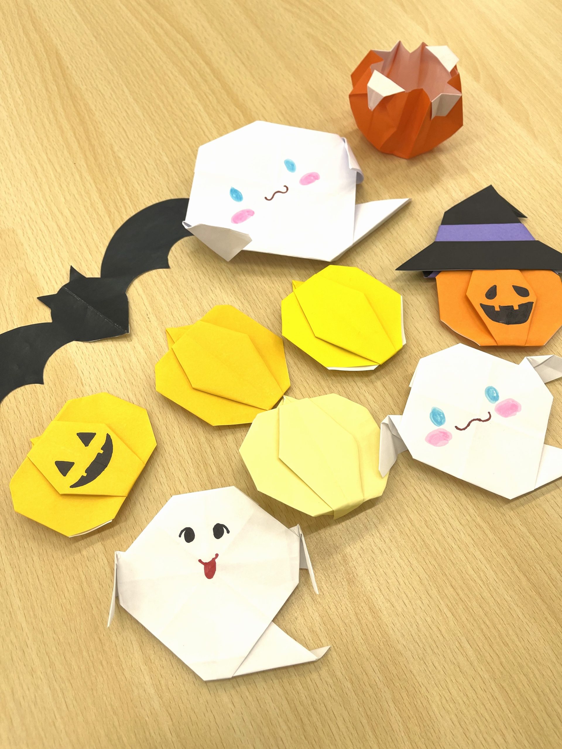 オレンジや黄色、白色の折り紙でジャック・オー・ランタンとゴーストを折り紙を折って作りました!