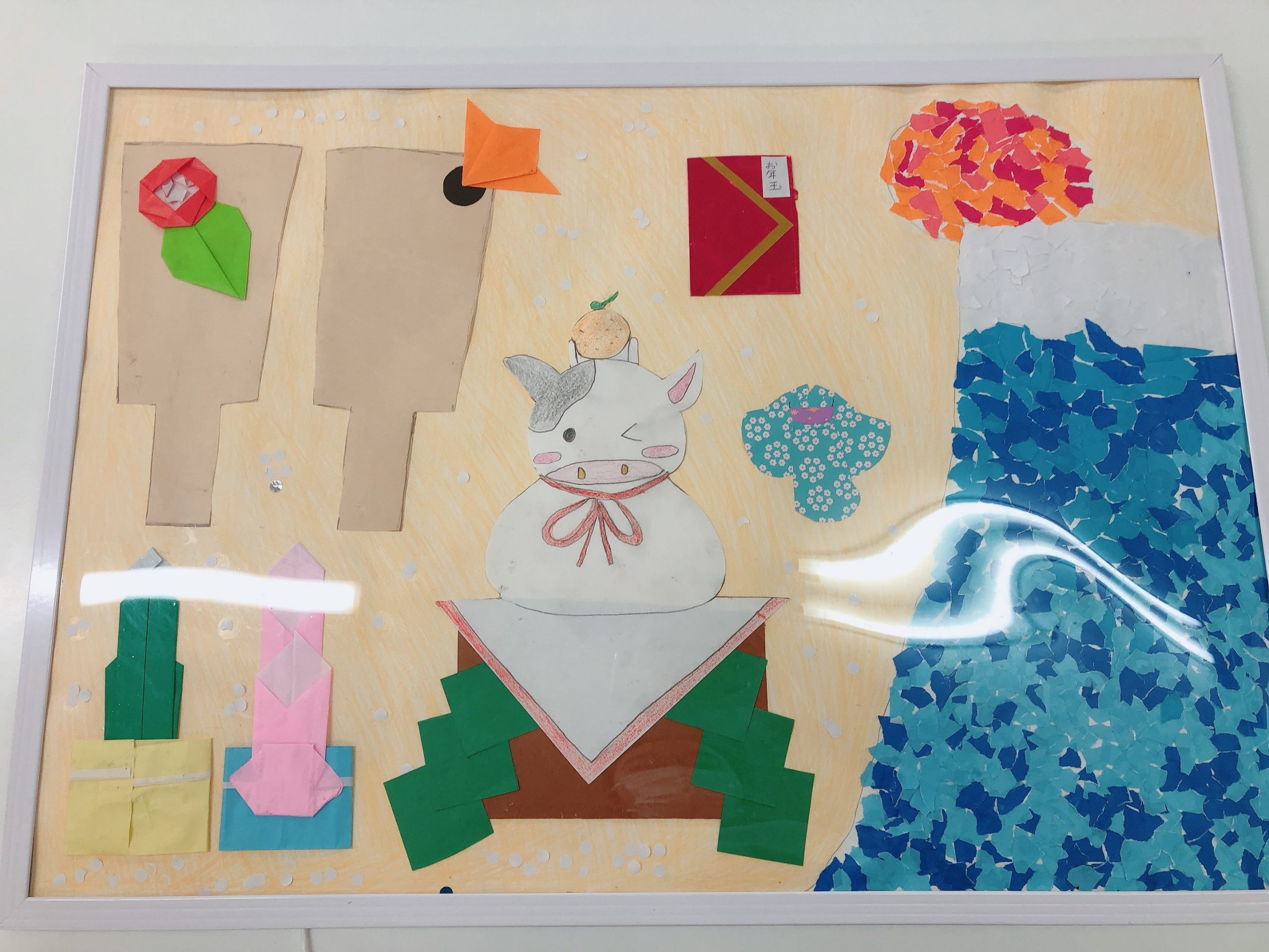 写真は左:キャンパスの写真 右:1月のイメージ壁画です。他にもパズル作成や巨大ちぎり絵など作成しています