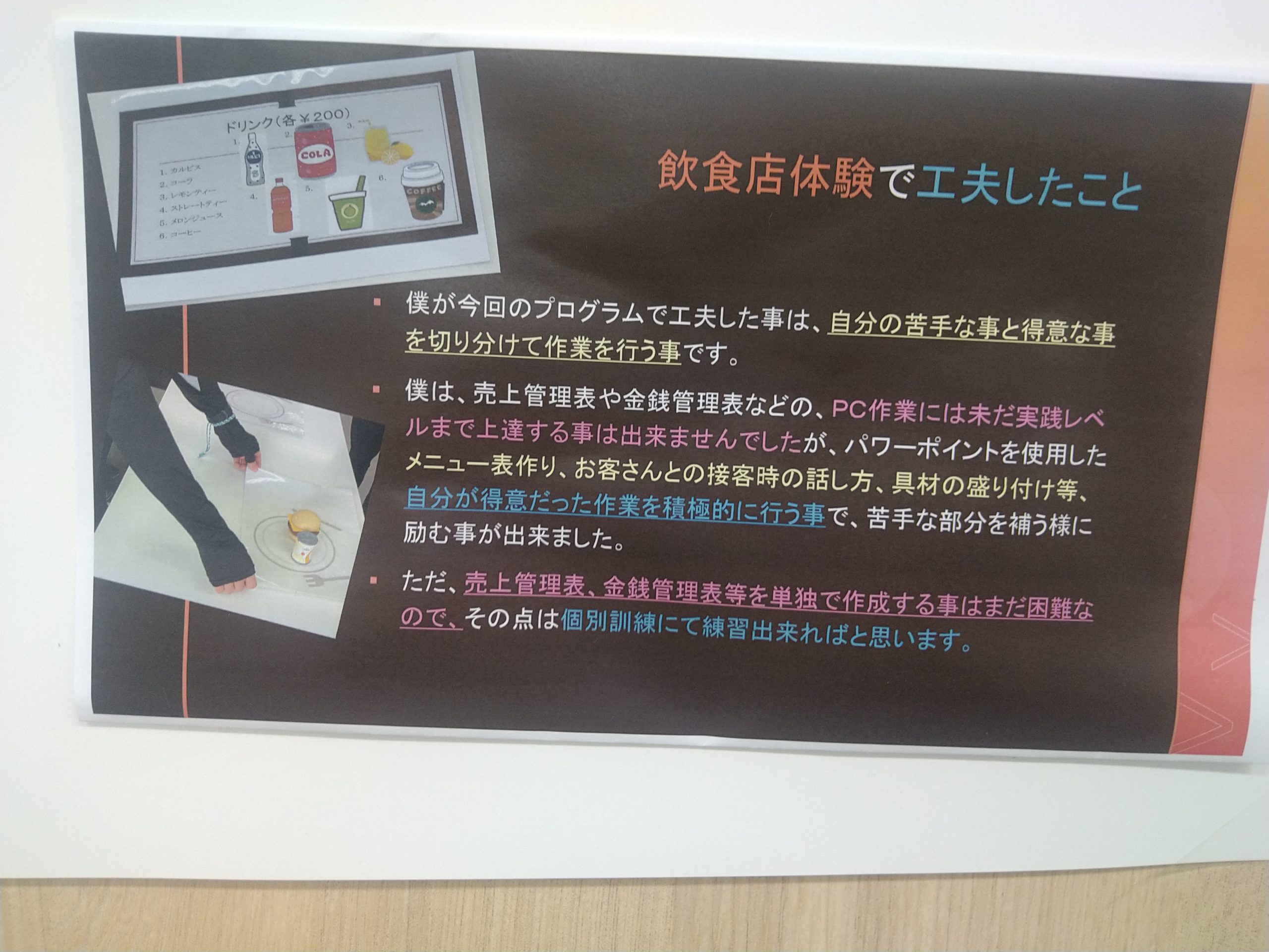 今回横浜キャンパスでは、PC寺子屋(メンバー同士が協力しながらPCを使用した訓練を行う)というプログラムで4週にわたり、「飲食店のメニュー作り」「お小遣い帳と売上表を作ろう」「お買い物体験をしよう」「お買い物体験をしよう~ポートフォリオ編~」をそれぞれ行いました。