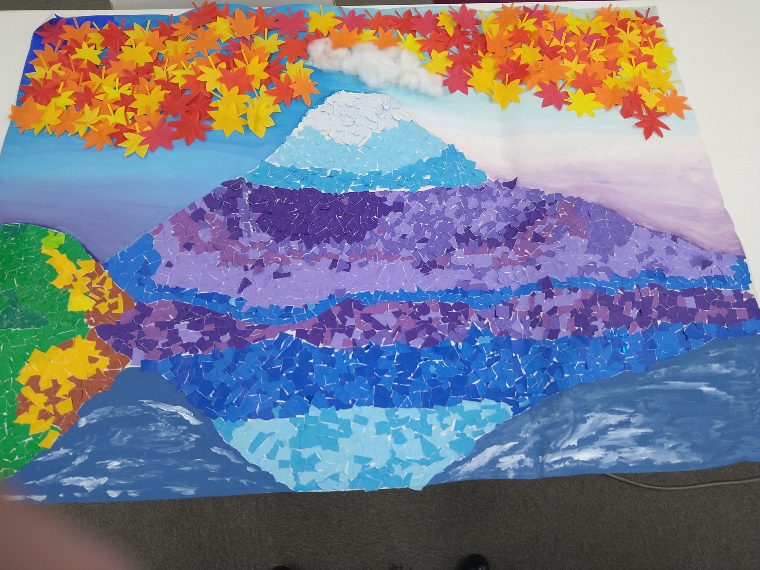 また秋祭りのために巨大な壁画も完成しました!これは秋をイメージした、紅葉や富士山を色を塗ったり、ちぎり絵で完成させています!一見の価値ありです!✨✨
