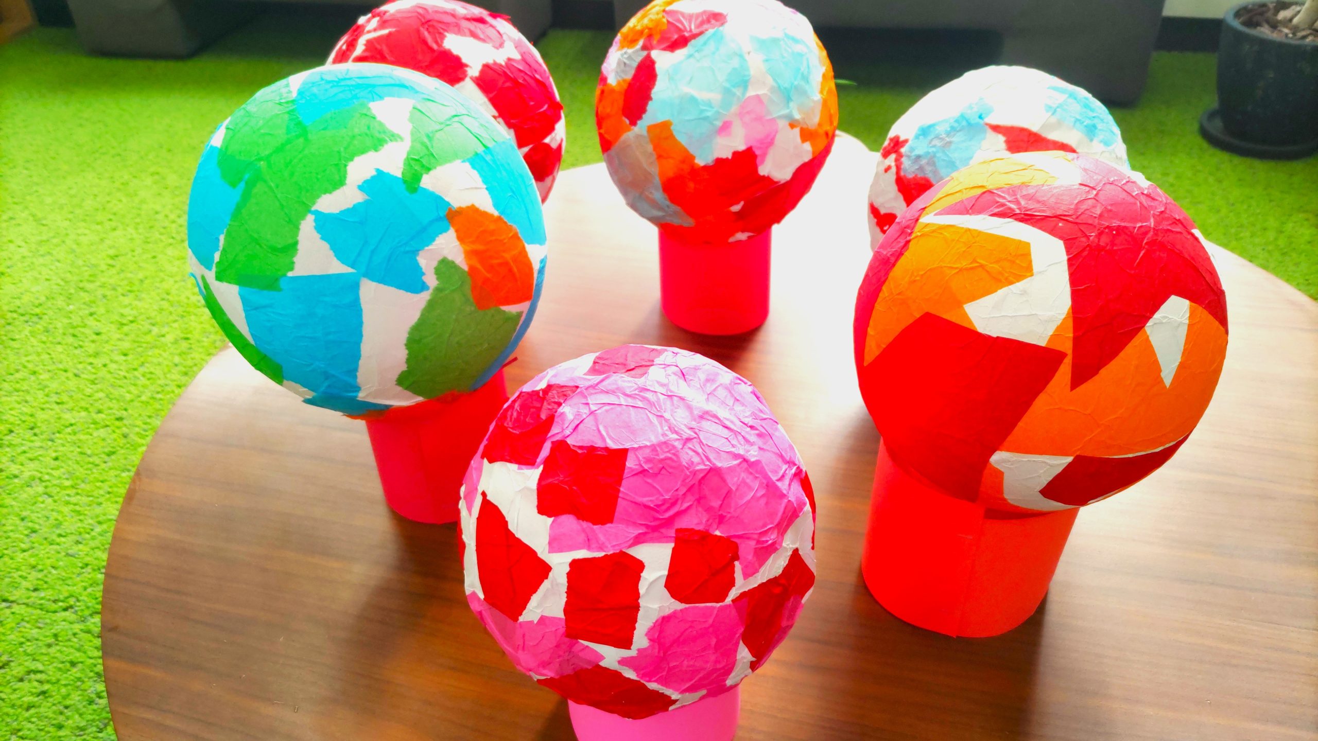 作り方は簡単で、、膨らました風船のまわりに半紙を貼り付けていき、その上にさらにお花紙を貼り付けます。