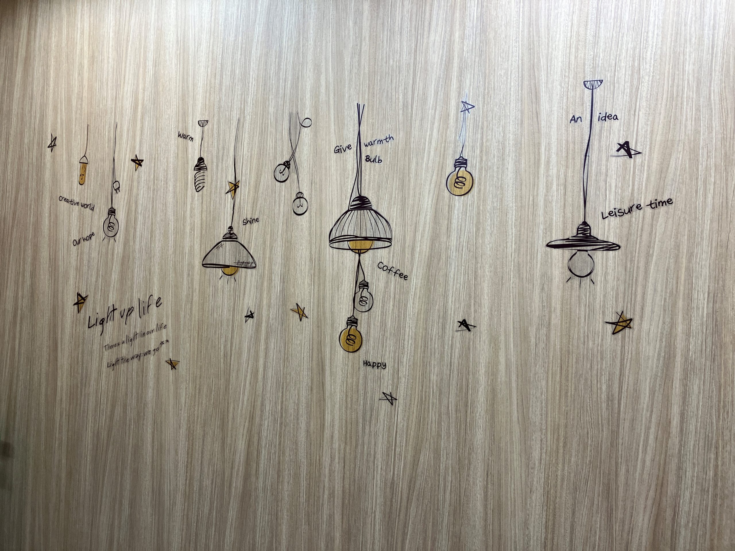 こちらの写真は、面談室の装飾でカフェ風のウォールステッカーを貼りました!
