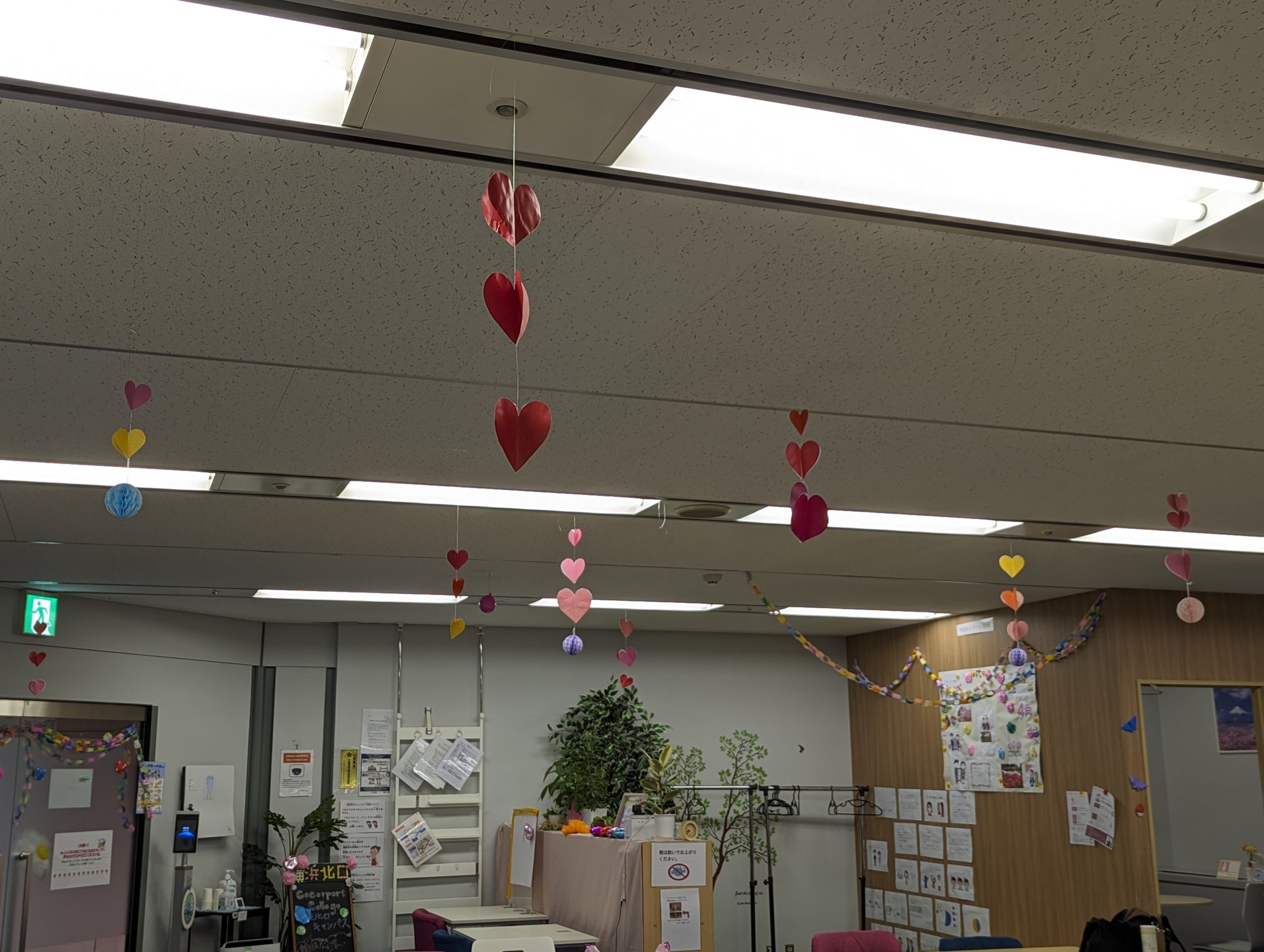 壁面以外、天井からも飾りをたくさんつけています。メンバーさんにこのハートも作っていただきました