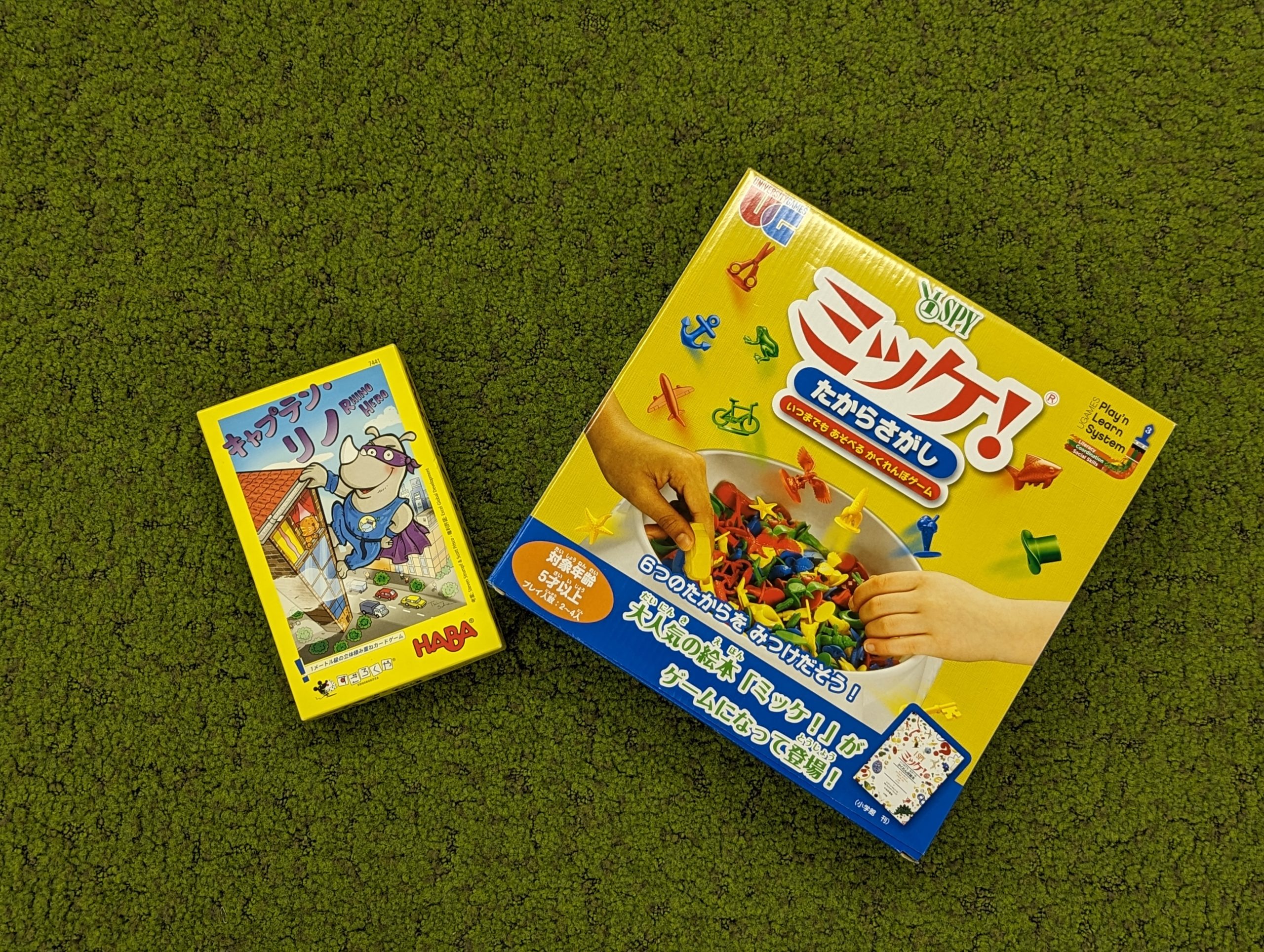 こちらは絵本のミッケを基にしたゲームです。お皿の中から配られたカードに書いてあるのと同じフィギュアを時間内に探します。先にカードに書かれているフィギュアすべてそろえると優勝です。時間内に見つからない!ということもあれば時間内に3個も見つけた!という場合も。